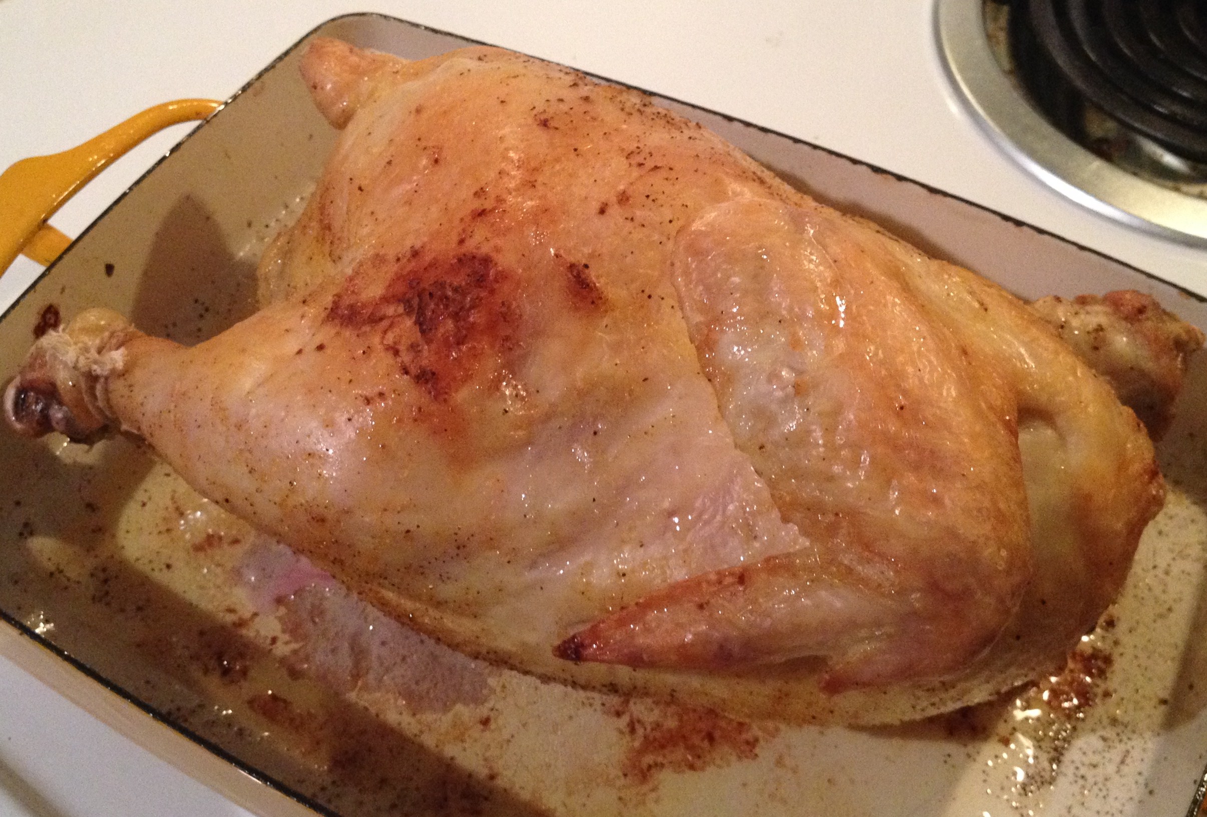 1. I think I feelexactly as you seem to feel. This was a good exercise in roasting but, seriously? I purchase plump organic chickens and have pretty good luck with less effort. That being said, this was a very moist chicken and fun to try. I may still be on the same page as the French housewives – why not go to my local grocer and buy their very good rotisserie roast chicken? LOL