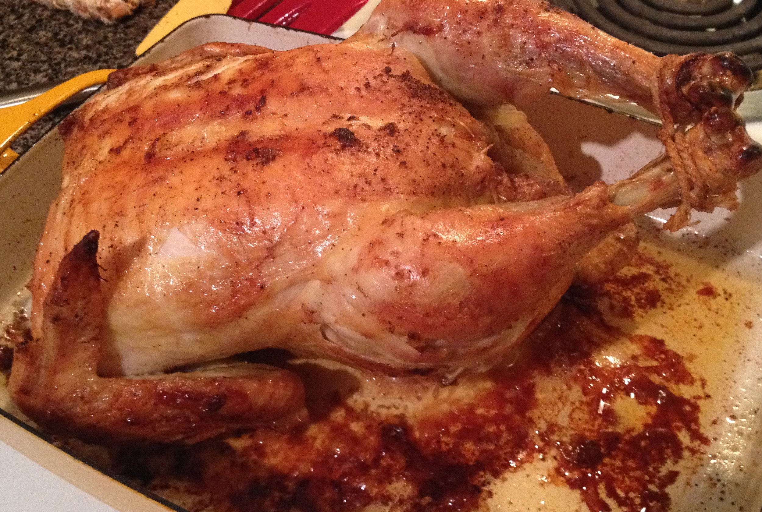 Once it’s reached it’s desired doneness, after about 45 minutes, the bird is removed from the oven, then manipulated into a rather unglamorous position, backside in the air. Kind of like those oh-so-funny pictures of mom leaning over for a package on Christmas morning. It gets propped up in a bowl (at least that’s how I read the directions, but in my typical fashion, I wasn’t willing to dirty up a bunch more dishes…so I left it in the original baking dish and positioned it resting on a small bowl).