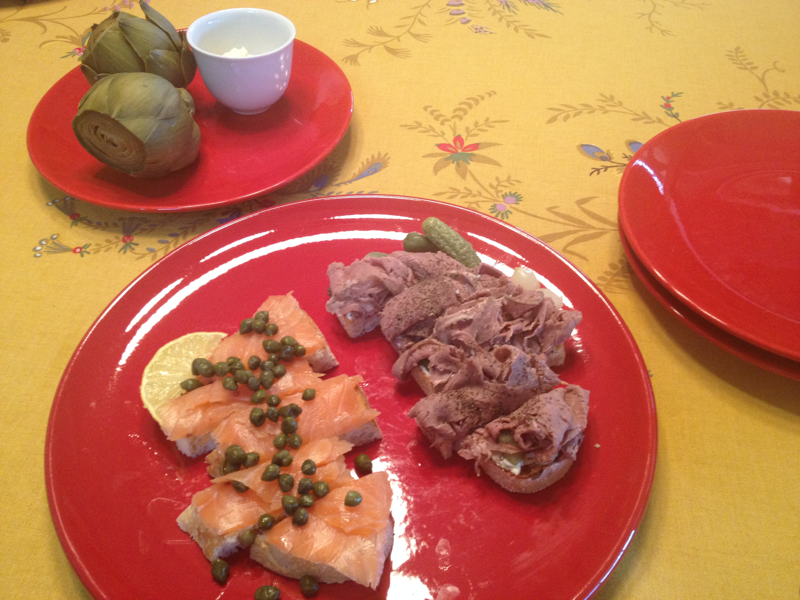 Dorie’s recipe recalls a favorite cafe of hers in Paris, La Croix Rouge. The recipe is for “tartines”, or open-faced sandwiches – in this case two different combinations: rare roast beef and cornichons (the saint germain), and the other smoked salmon with capers (the norvegienne). Of course, on some beautiful bread.