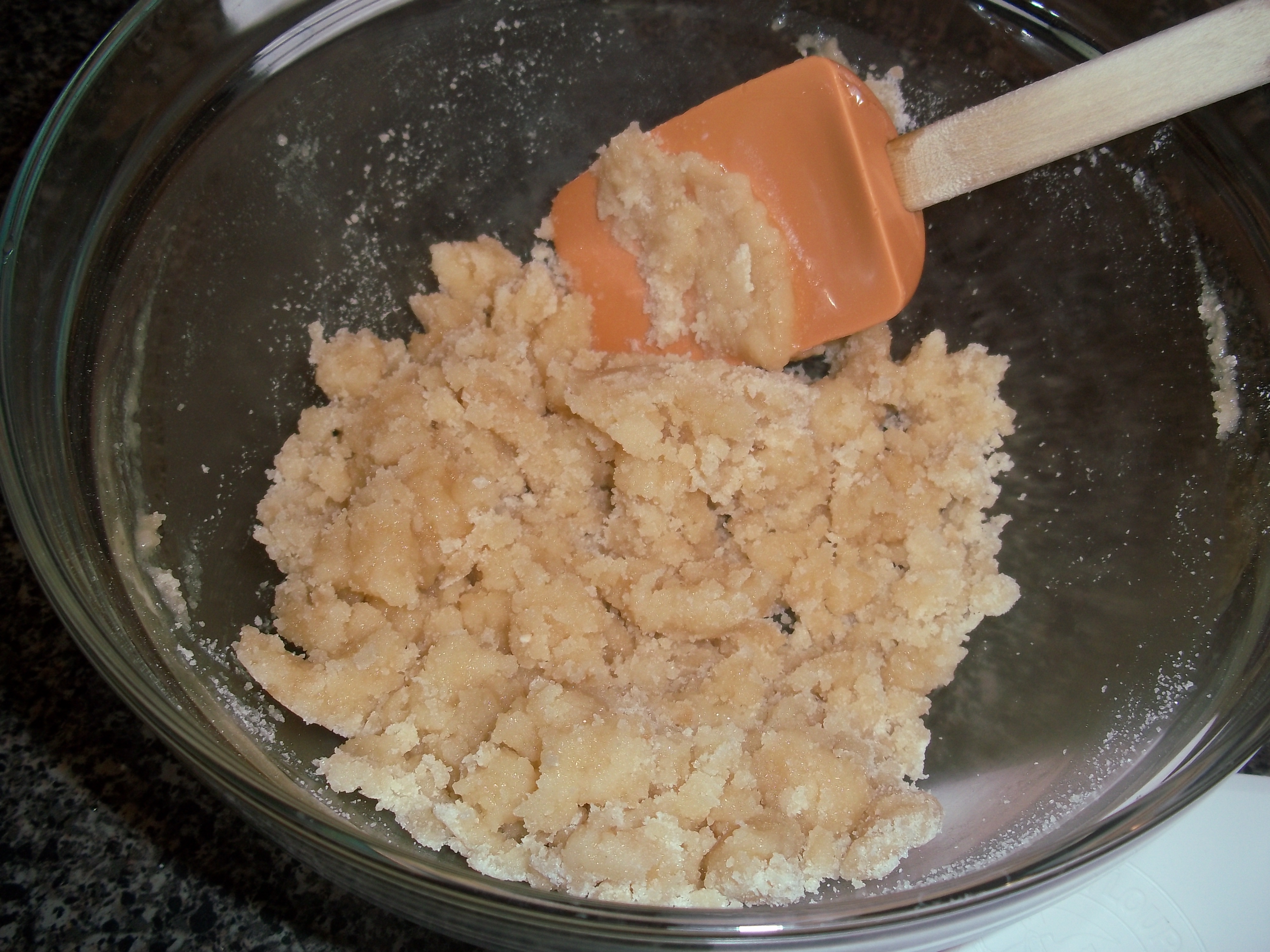 Such a simple process: the dry ingredients are mixed together (flour, sugar, a touch of salt), then the butter is added, along with the vanilla. This comes together as kind of a rough mixture, but that’s all right!