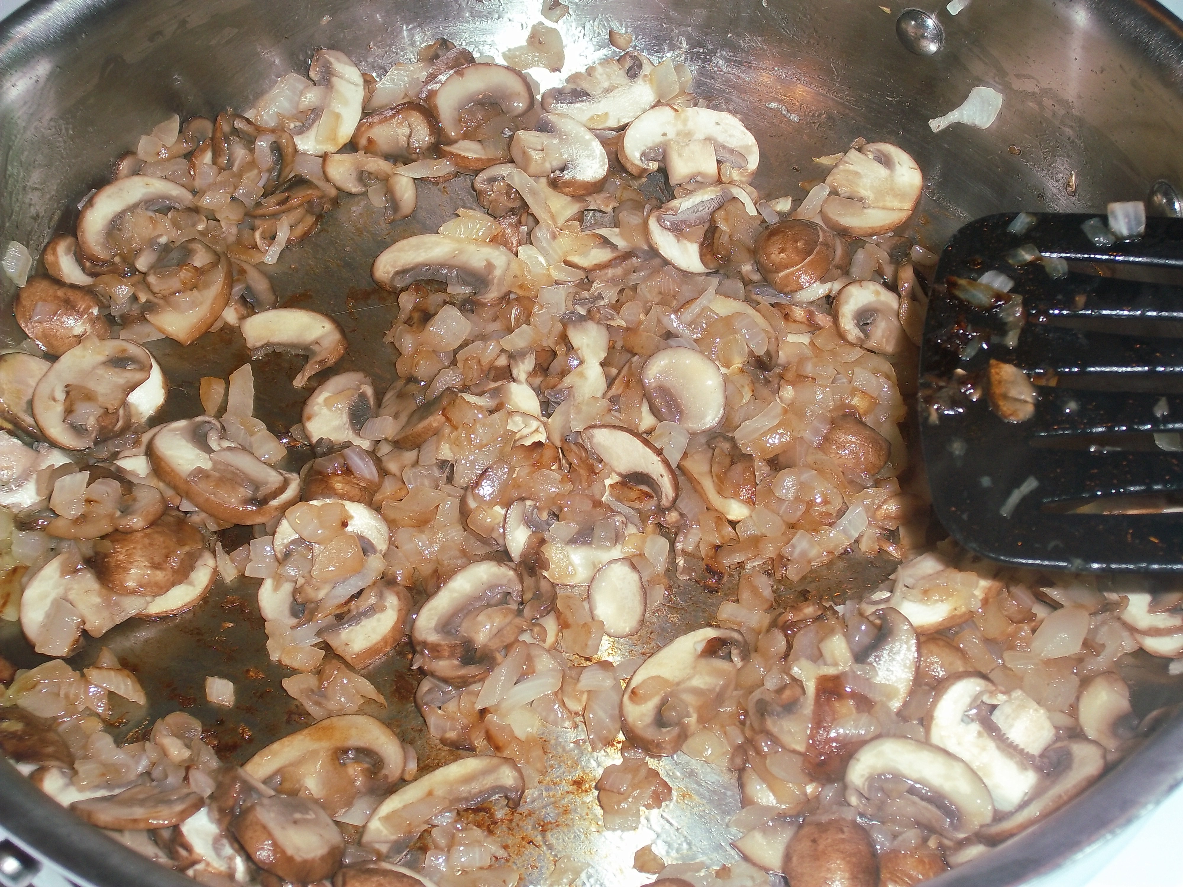Heat the oil in a large skillet or wide saucepan, and add the onion. Cook that, stirring occasionally for about 5 minutes, until just beginning to brown. Add the mushrooms, and continue to saute for another 5 minutes or so until tender. (another note on mushrooms: if you are using white or crimini mushrooms, the freshest one are those with the top and stem still connected – if you can see the ribs, the mushrooms are older).