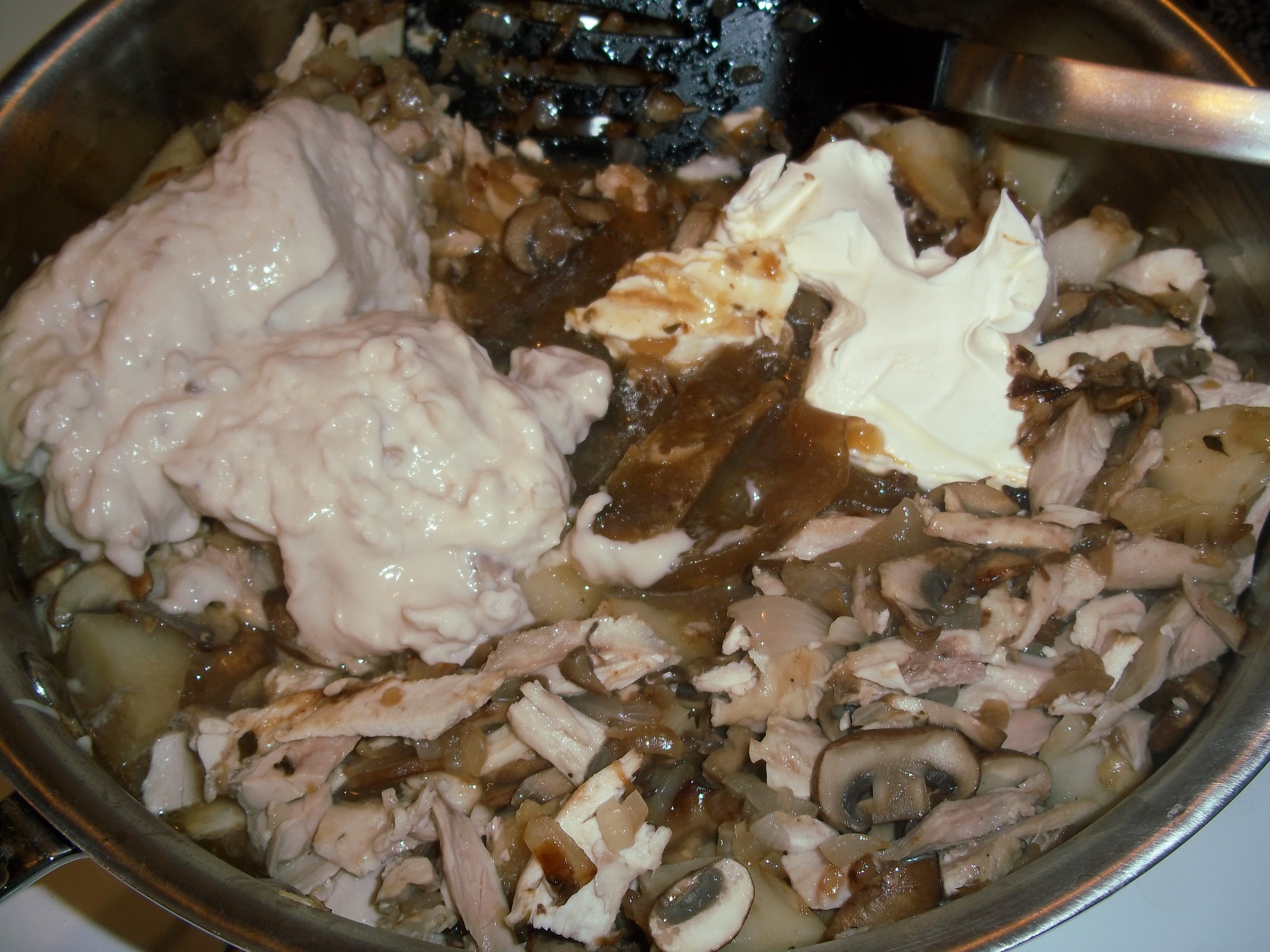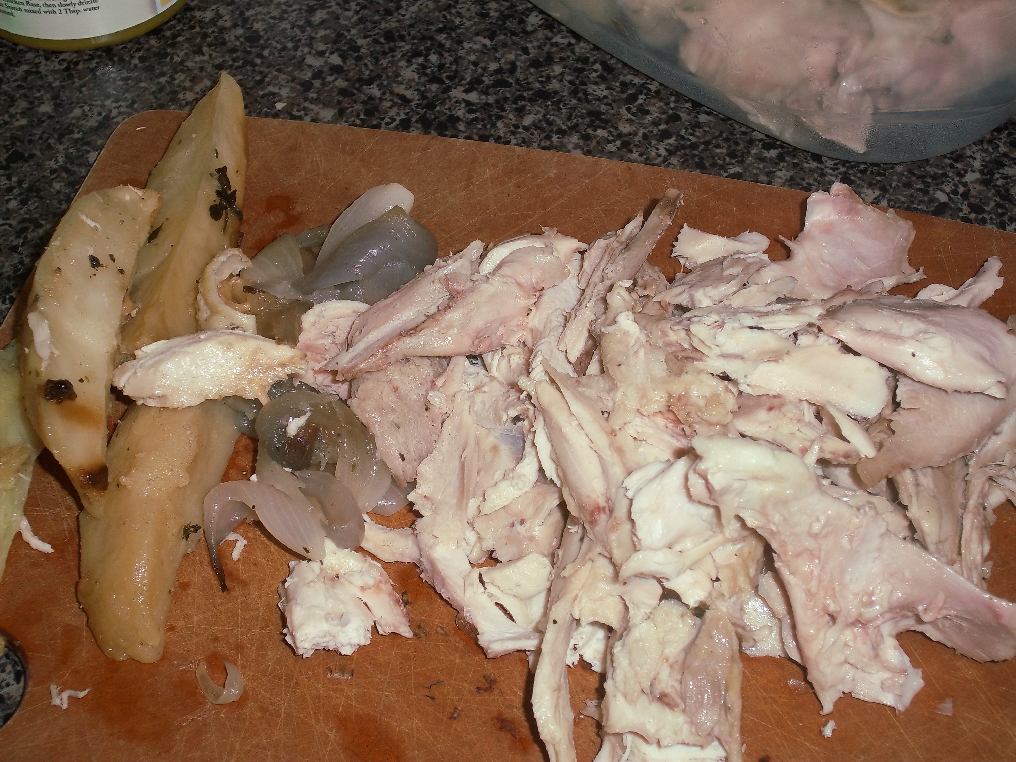 While the vegetables are cooking, remove the chicken from the bone and cut it into chunks, along with any vegetables left over. If you’d used other potato types or carrots, they would be great here. Don’t forget the roasted garlic as well. For this I used half of the head of roasted garlic. If you are using a roasted chicken from the market, you won’t have the advantage of these extras, but it will still be tasty. I chose to use the dark meat and some of the white meat for this, saving some of the chicken breast for another meal. You can also assemble your other ingredients. Everything but the final seasoning gets added into the mushroom mixture.