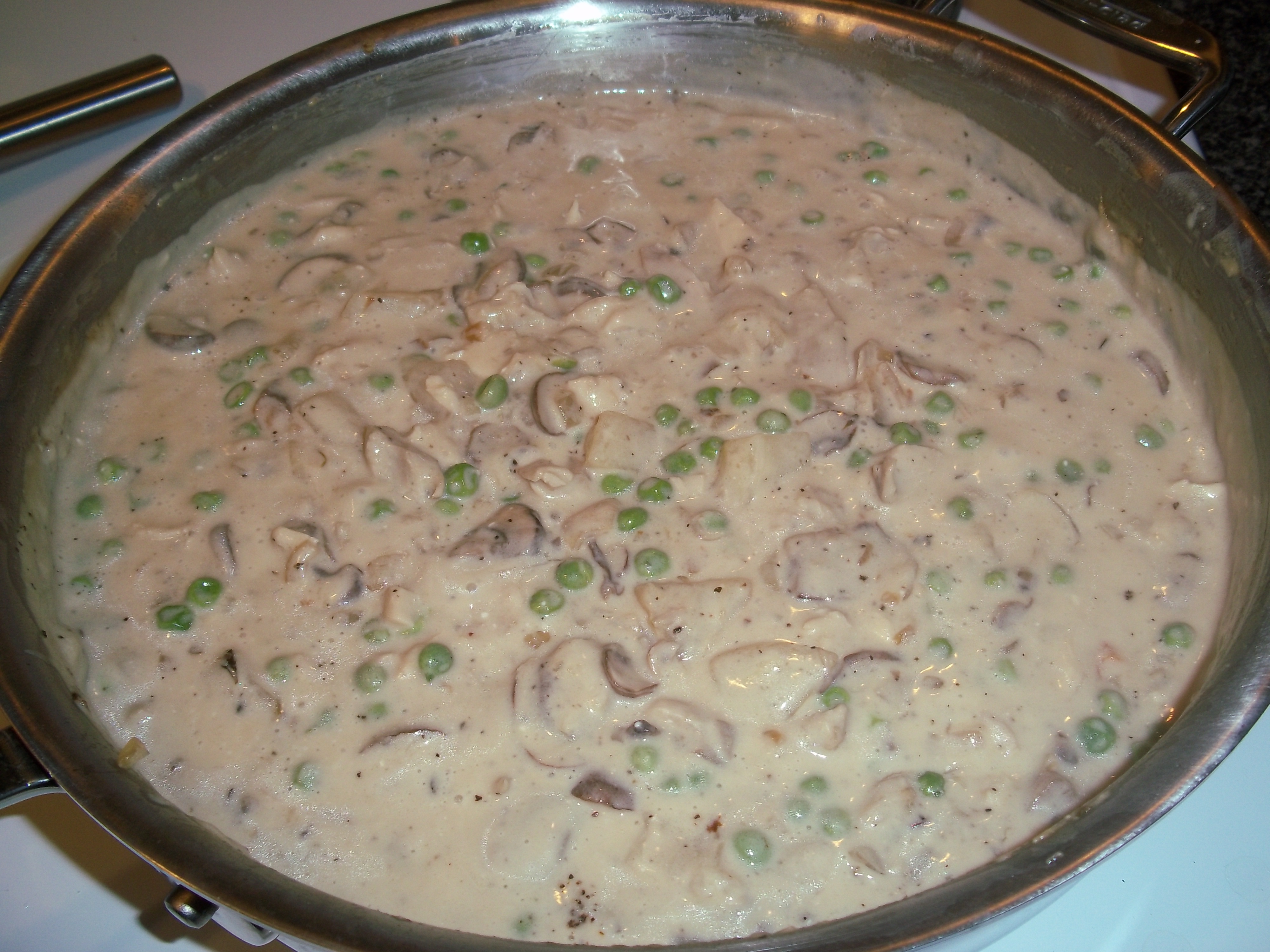 This gets simmered together, seasoned and the peas added. It only takes a few minutes to finish up once the peas are added. By this time, the biscuits should be coming out of the oven.