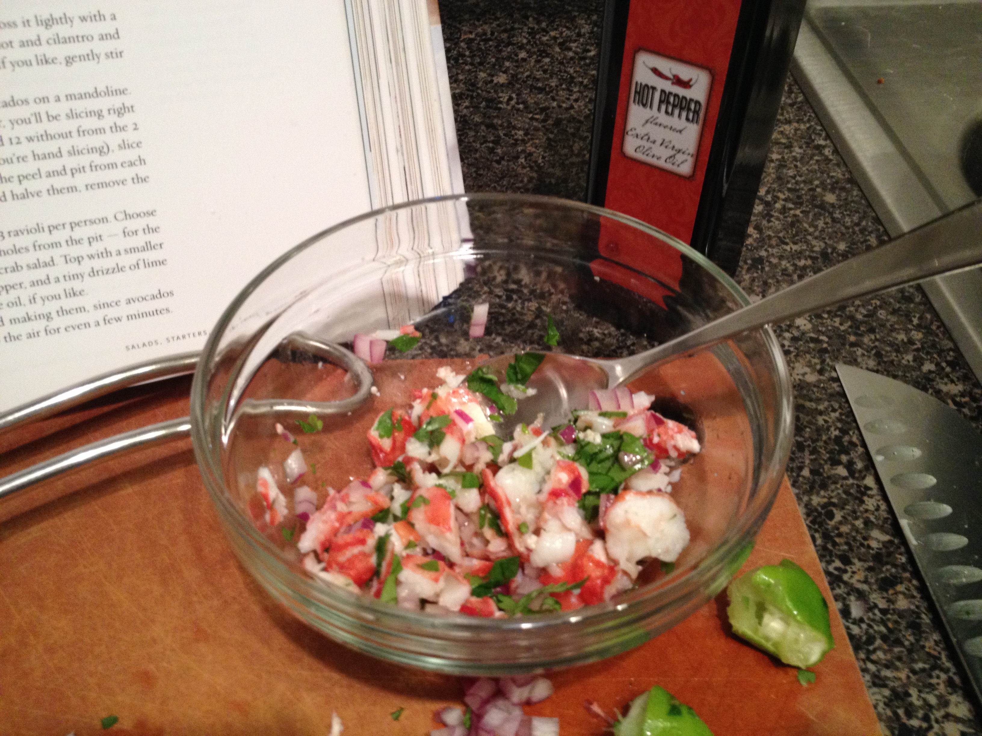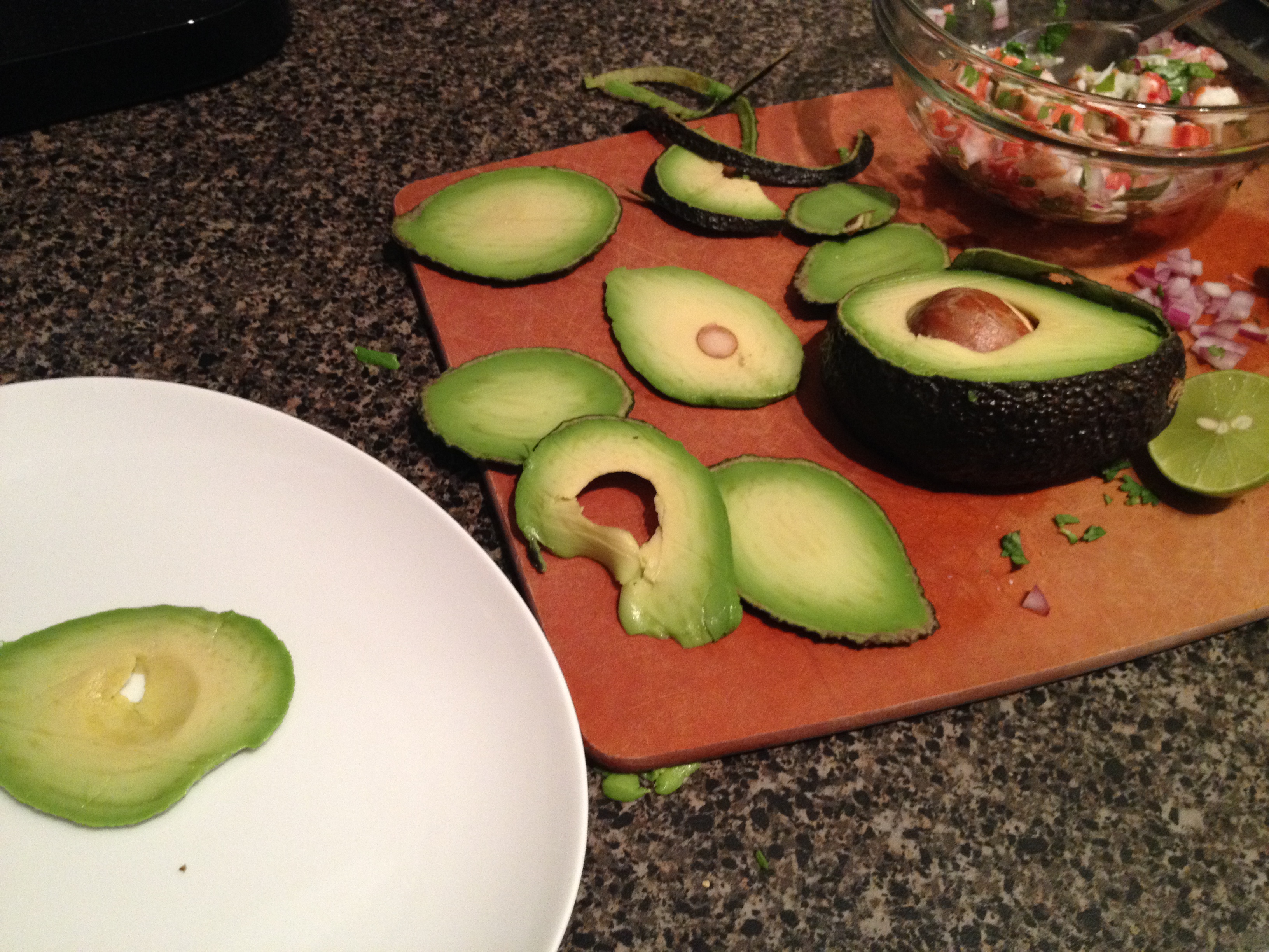 This is a combination of flavors that I think is fabulous. And while I thought that the method would likely get a little fussy, this preparation seemed like a fun idea. This is really a simple crab salad layered between thinly sliced avocado. The trick is how the chef that showed Dorie to make it using a mandoline to slice the avocados thinly, with the skin and pits in place. It sounded worth the try. I used king crab for mine, since I was making a smaller amount, along with some diced red onion, cilantro, chile oil and some lime.