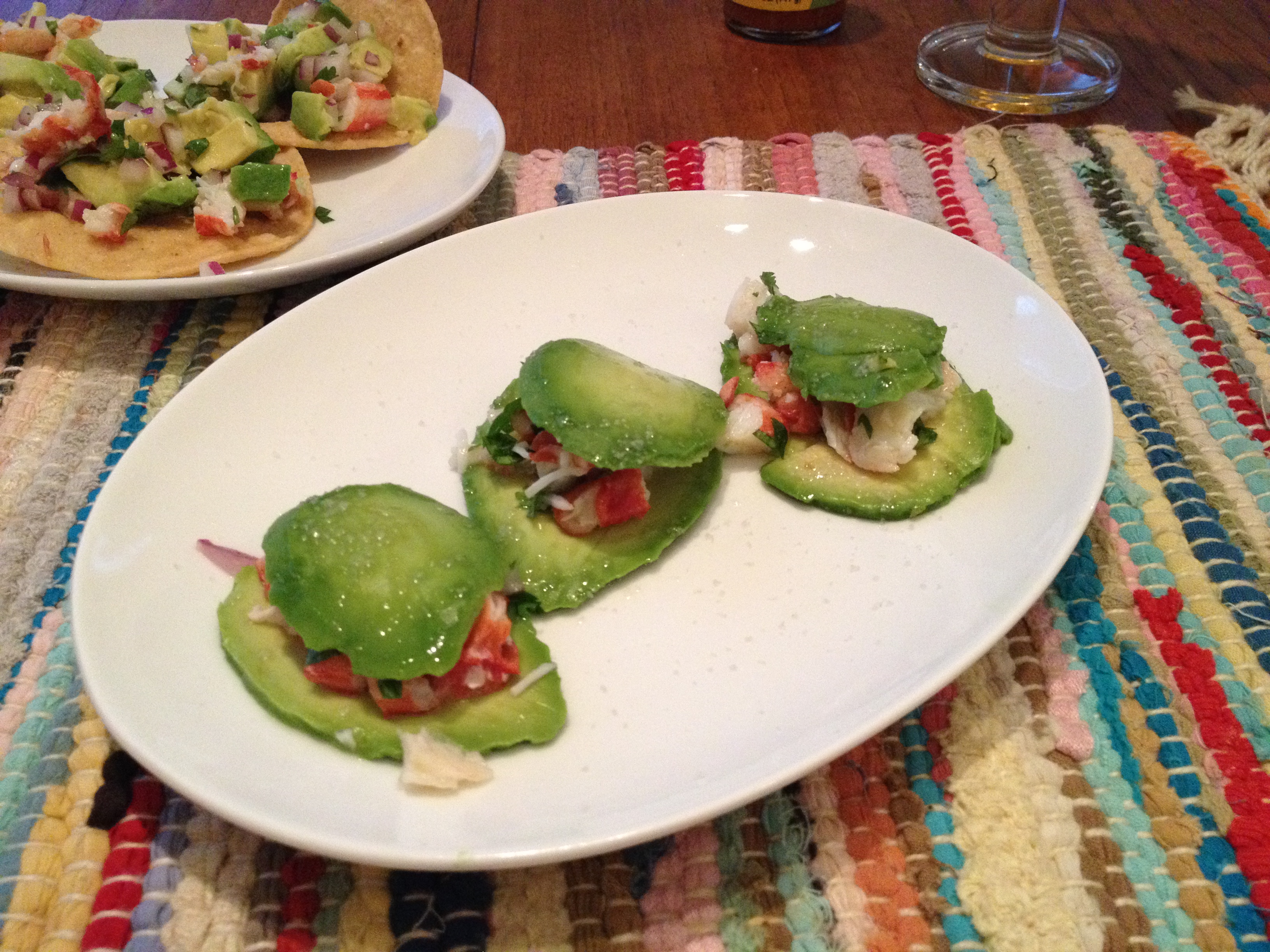 After assembling the ravioli, I chunked up the remainder of the avocado and added it to the crab salad. This I placed on some tostaditos (small fried corn tortillas). Both were good, though I wish I had added some hot sauce to either salad (but particularly the tostada version), because that really accentuates the flavors of the smooth avocado and salty-sweet of the crab. In very non-French fashion, these were served with some Mexican beer with lime, and of course a little hot sauce.