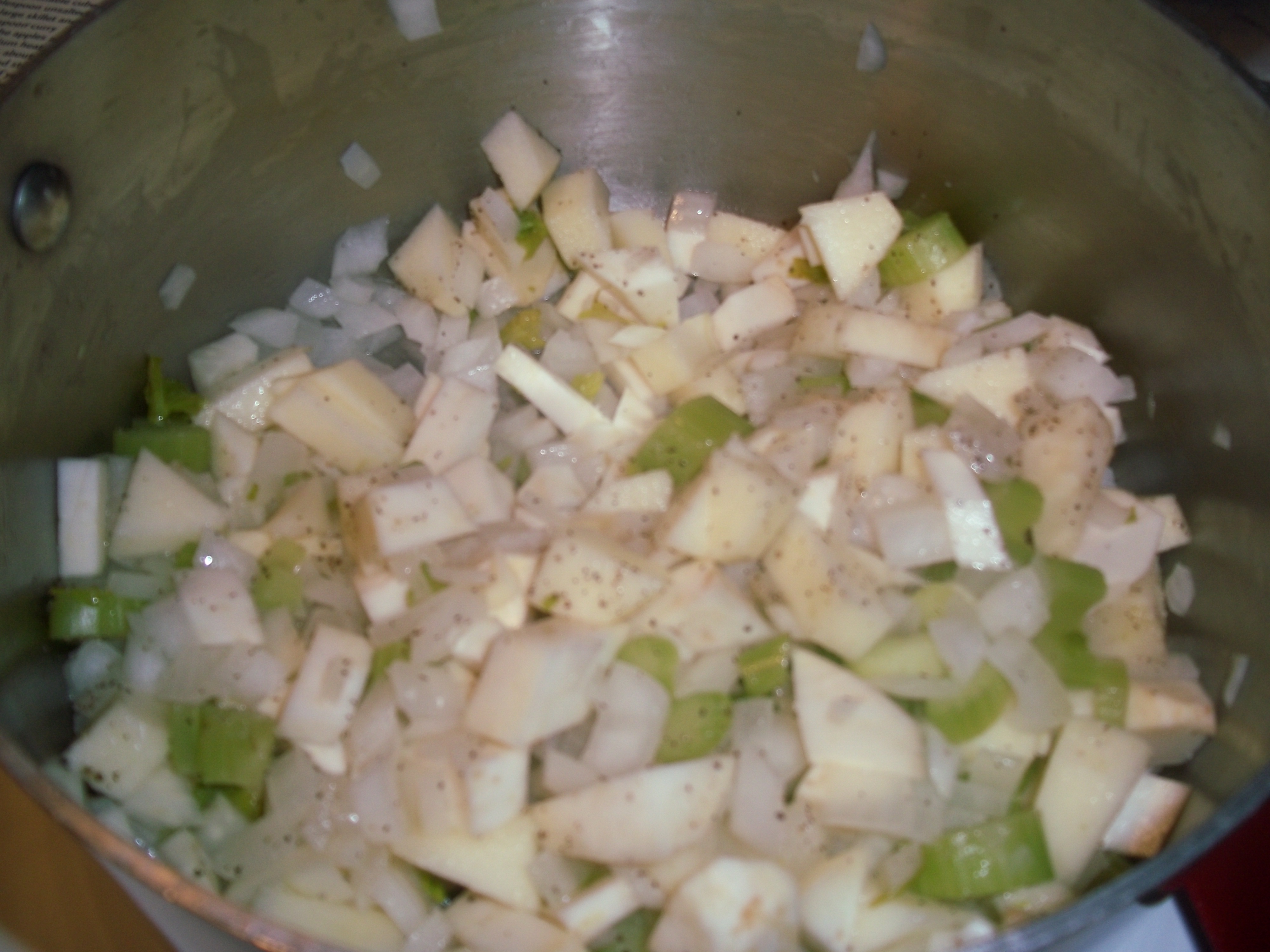 100_3652This is a simple mixture of vegetables tossed with a little butter and softened. Then vegetable broth along with fresh thyme and bay leaf are added. All of this gets simmered until the celery root is soft enough to mash with a spoon.