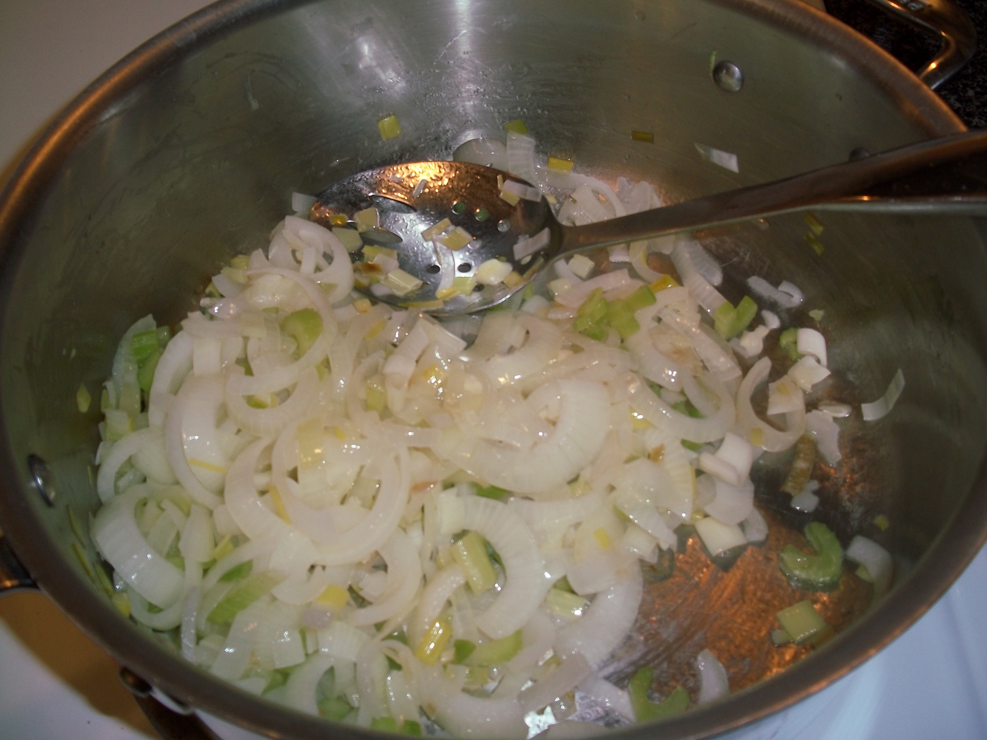 When I did my research on line, potatoes were suggested as a substitute. So I chose potatoes and thought I’d add some artichoke hearts for a little more flavor (though not fresh… that would have been better, but more time consuming – this was another between-conference calls-recipe for me) The ingredients are straightforward, the afore mentioned potatoes and artichokes, plus leek, onion, celery and garlic. Then a little chicken stock.