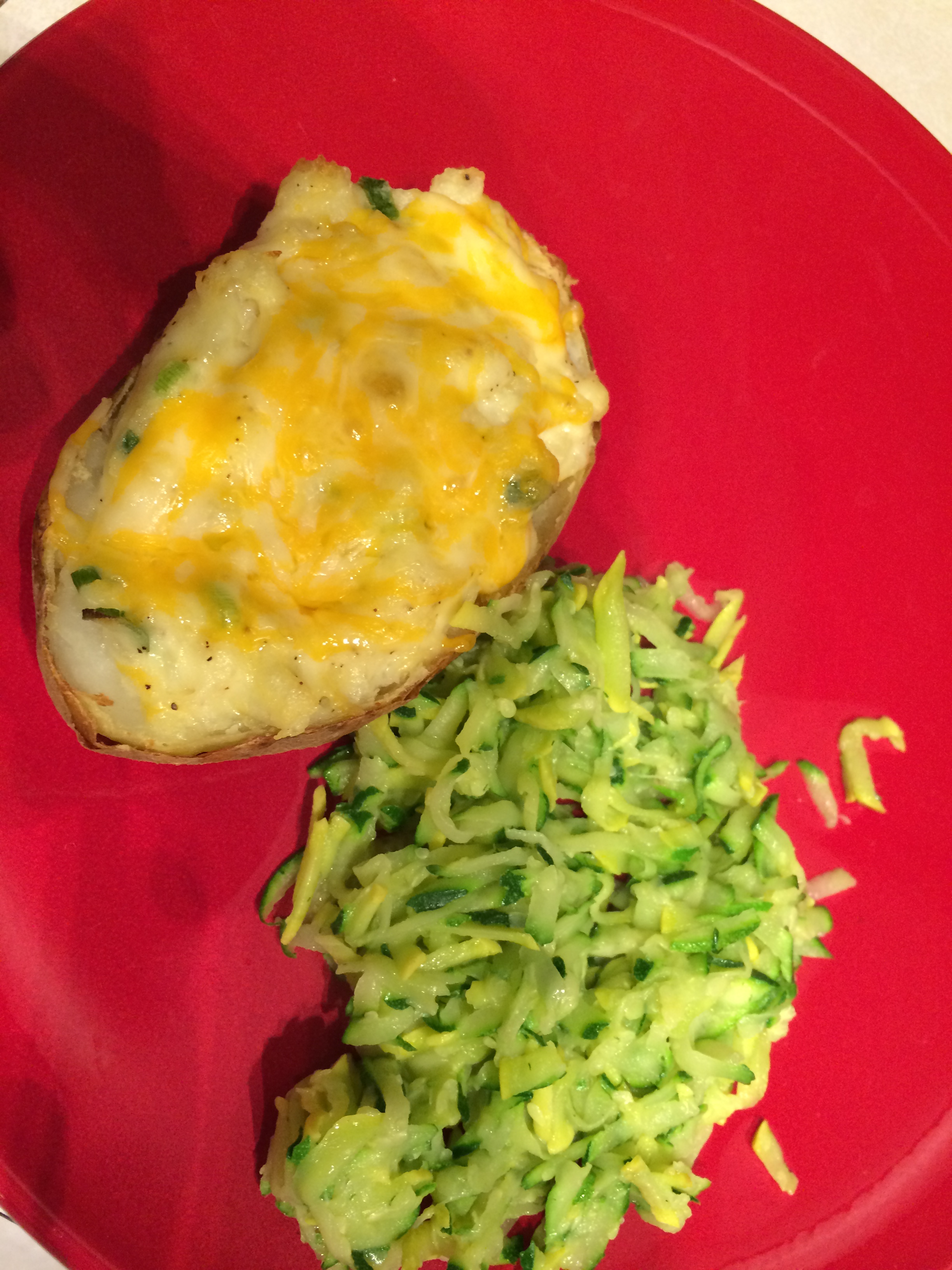 The other recipe I completed this month was for twice-baked potatoes. To be honest, I did make them to serve alongside something not-vegetarian-at-all, but these would make a delicious meal on their own, or with some shredded and sauteed squash (as I did here). They are simplicity itself. A baked potato, with the flesh scooped out, and combined with green onions, butter and sour cream, placed back in their shells and topped with some cheese. Then baked to heat through.