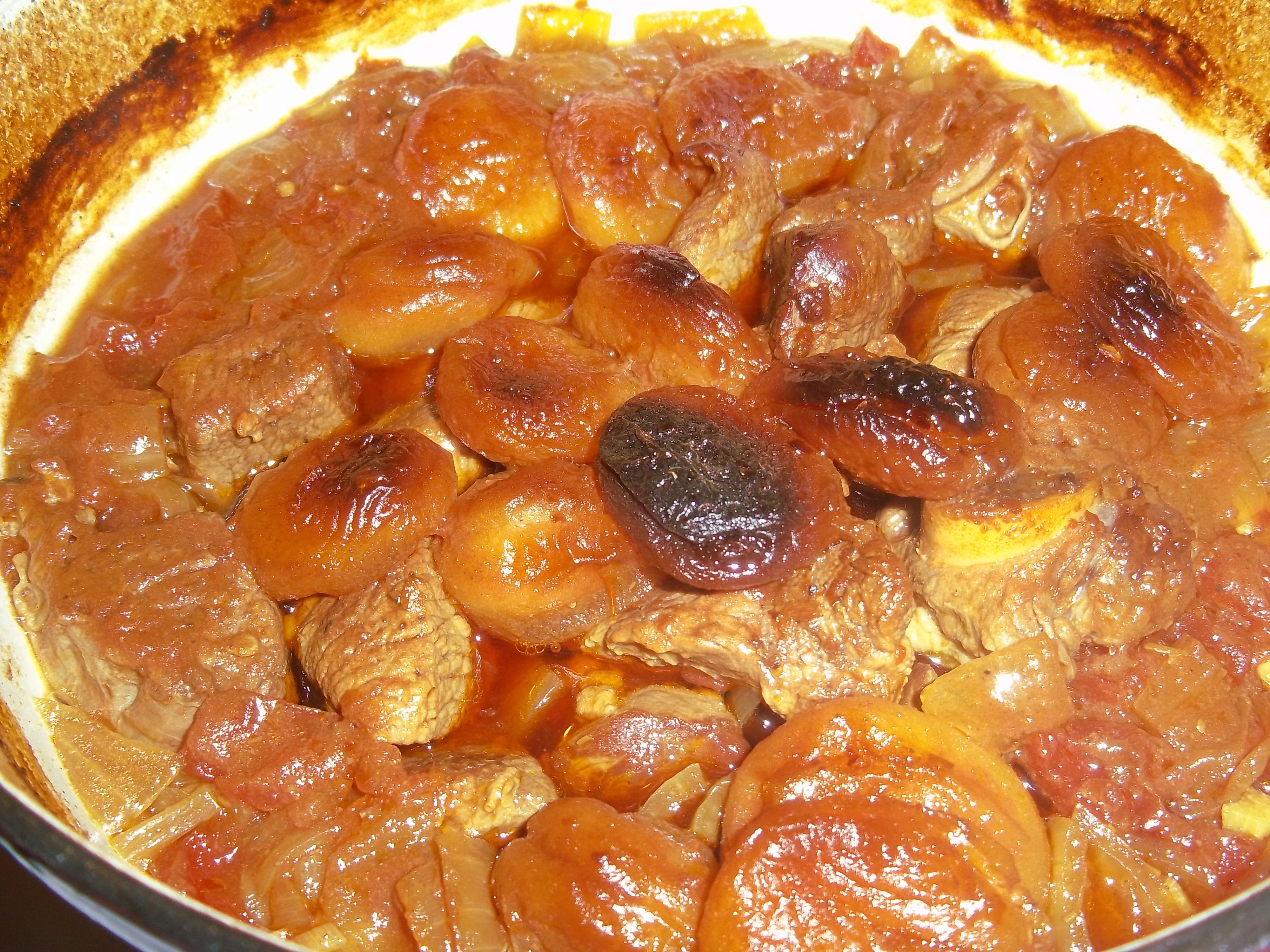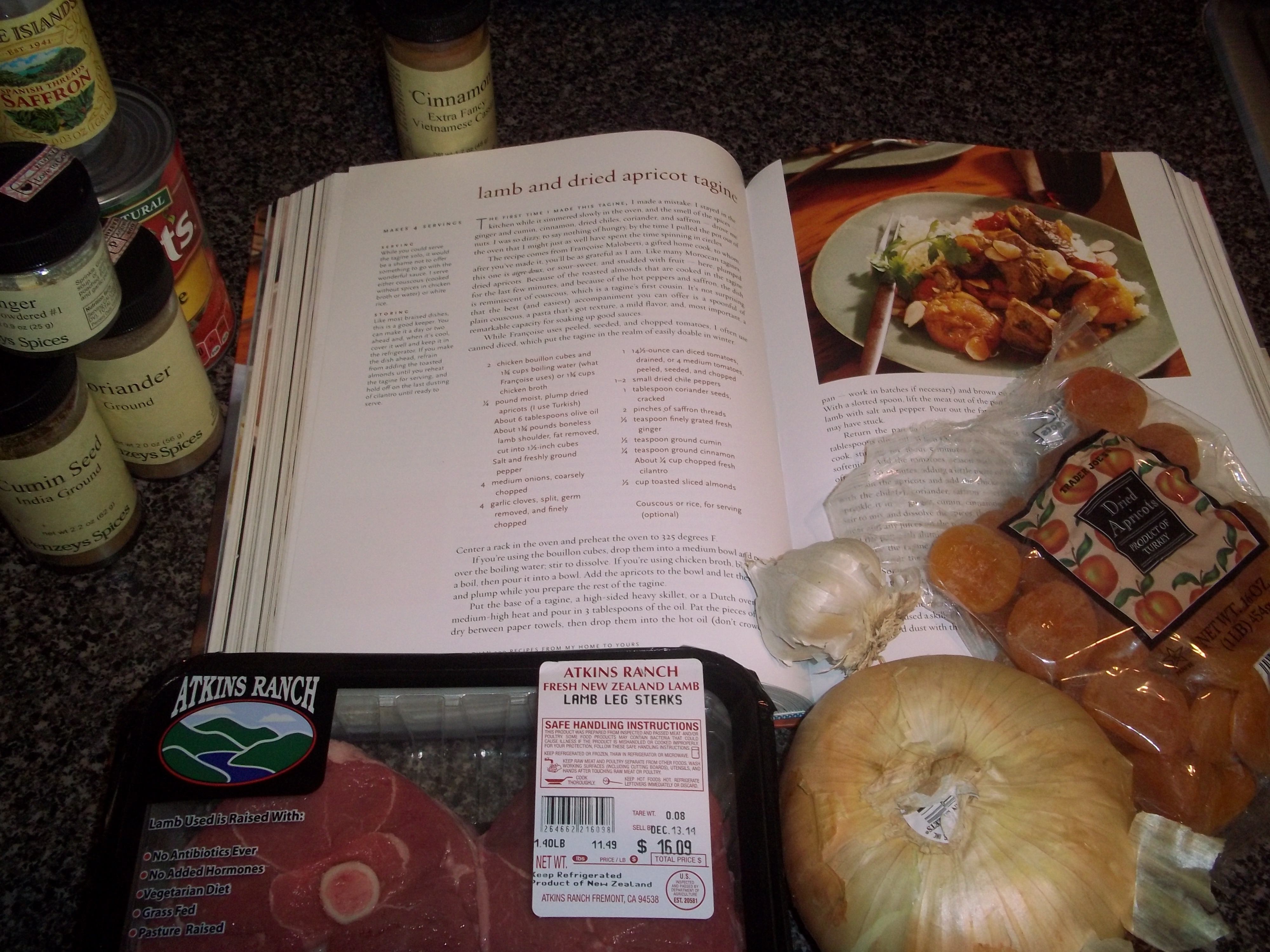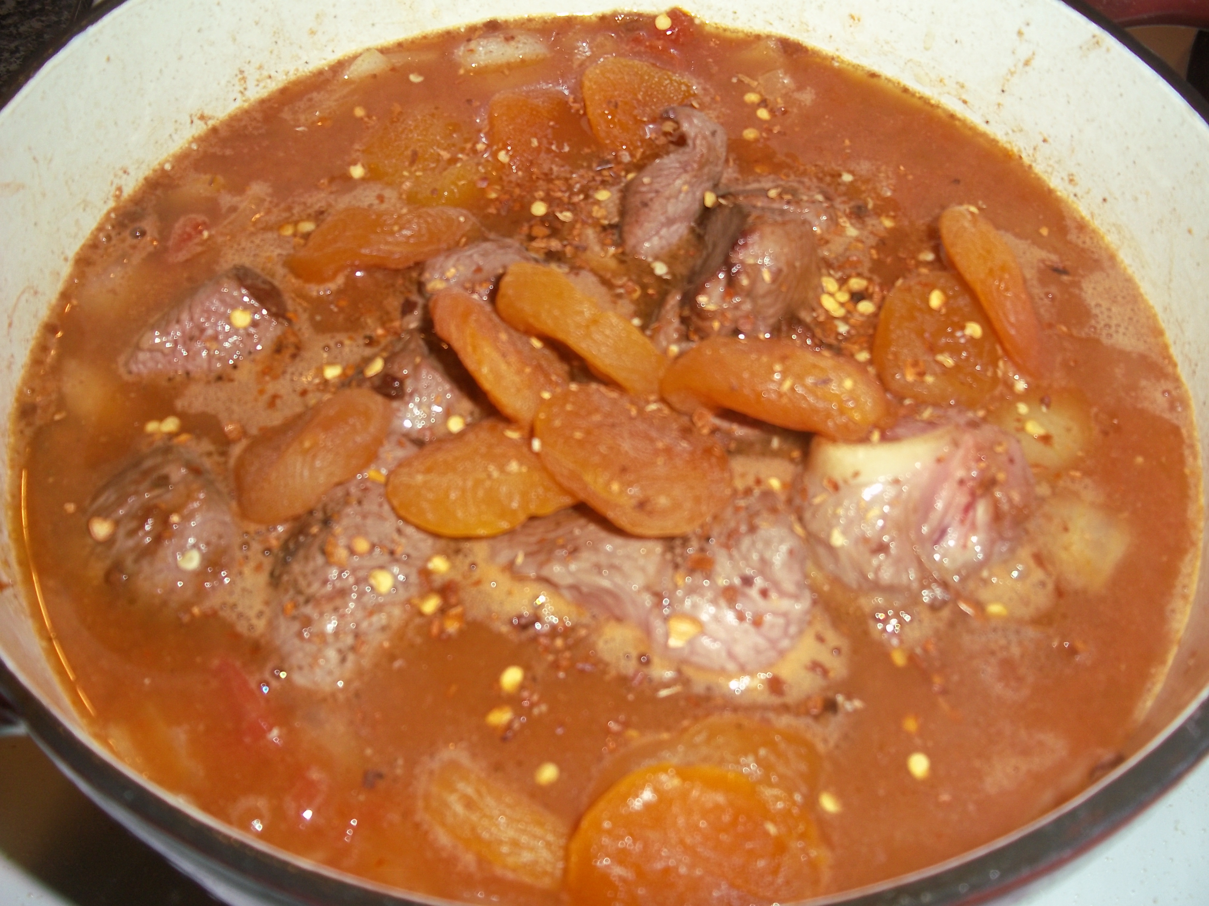 100_3756100_3757And then, the lamb and apricots are added on top, the whole thing covered tightly and then popped into a 325 degree oven for a nice long simmer.