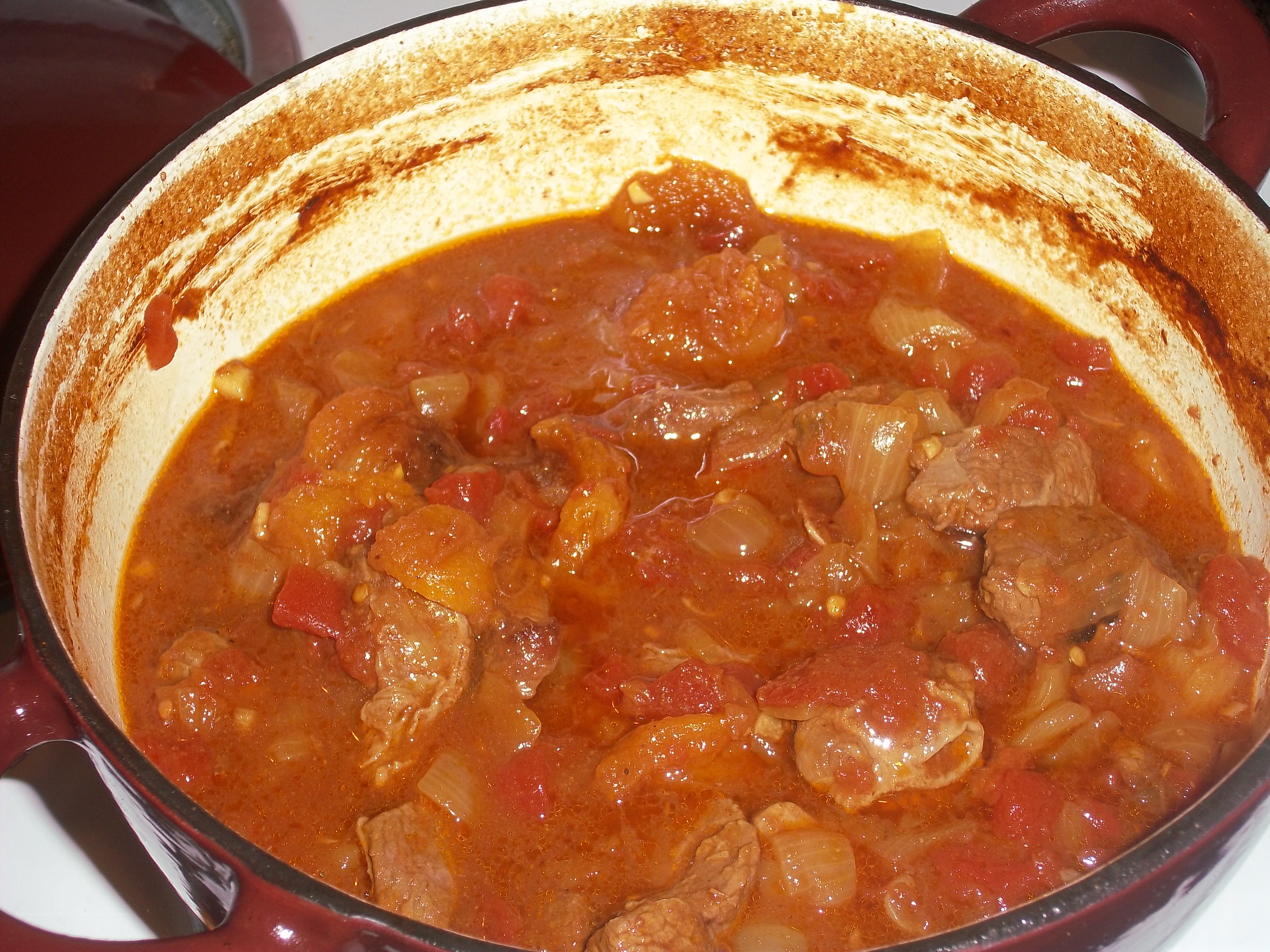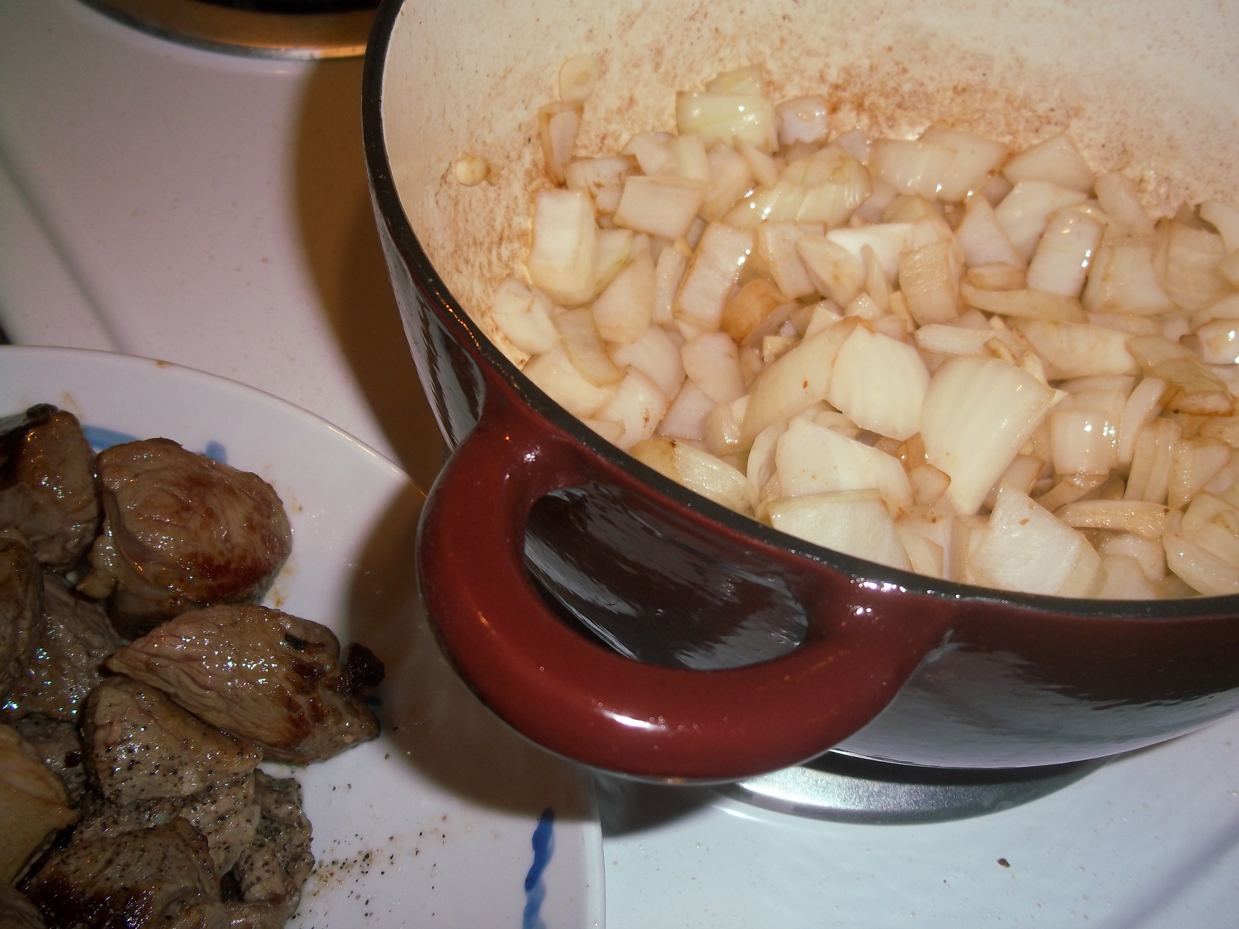 I used slices from a leg of lamb because that was what was most convenient. Perhaps even a bit too lean, but that eliminates steps down the road. The lamb gets cut into chunks and browned in a bit of olive oil – it takes a few shifts in the pan to brown all of the meat without crowding. Once that’s complete, the onions and garlic are added for their turn in the pan, stirring up all of the browned bits on the bottom.