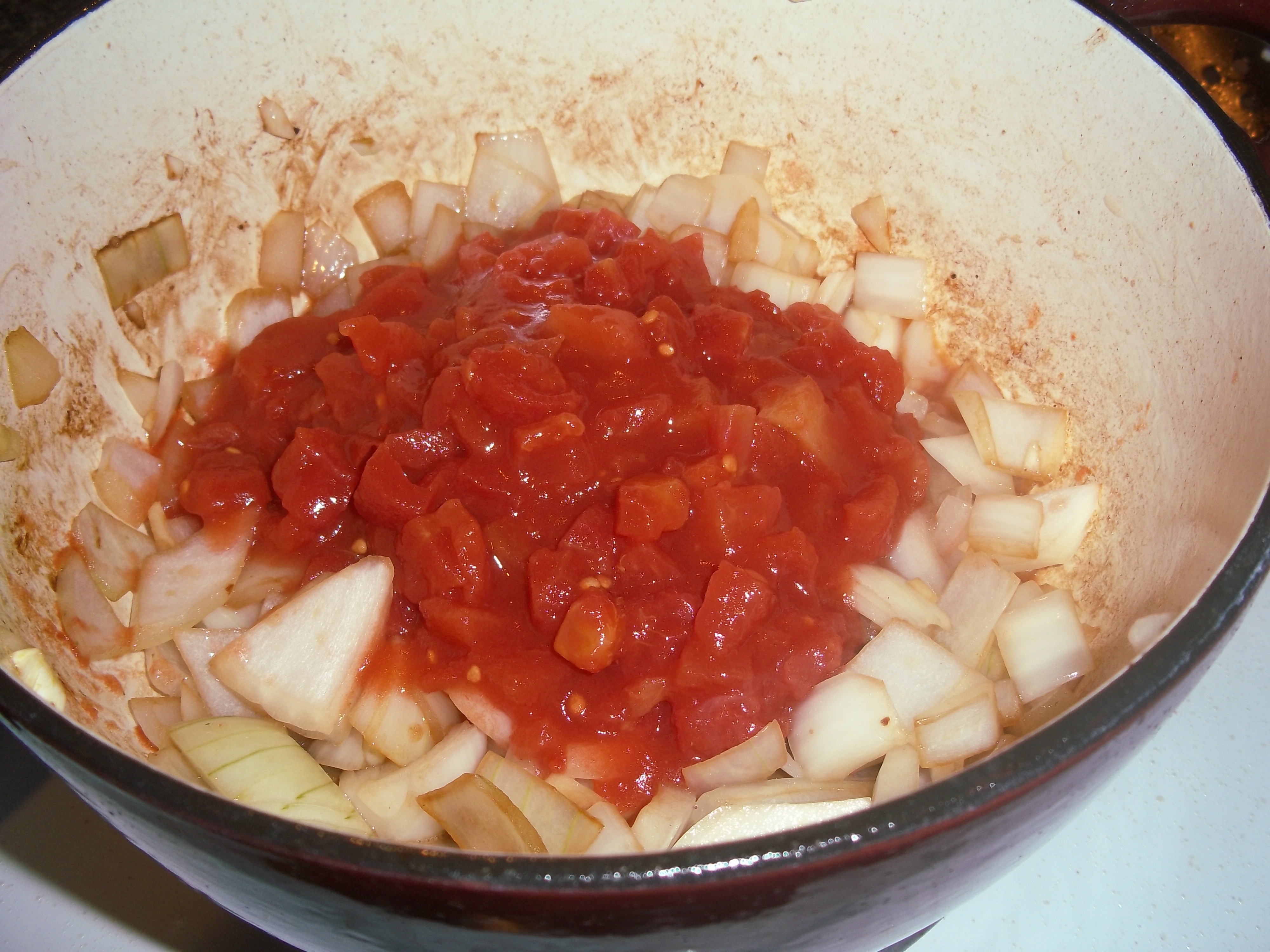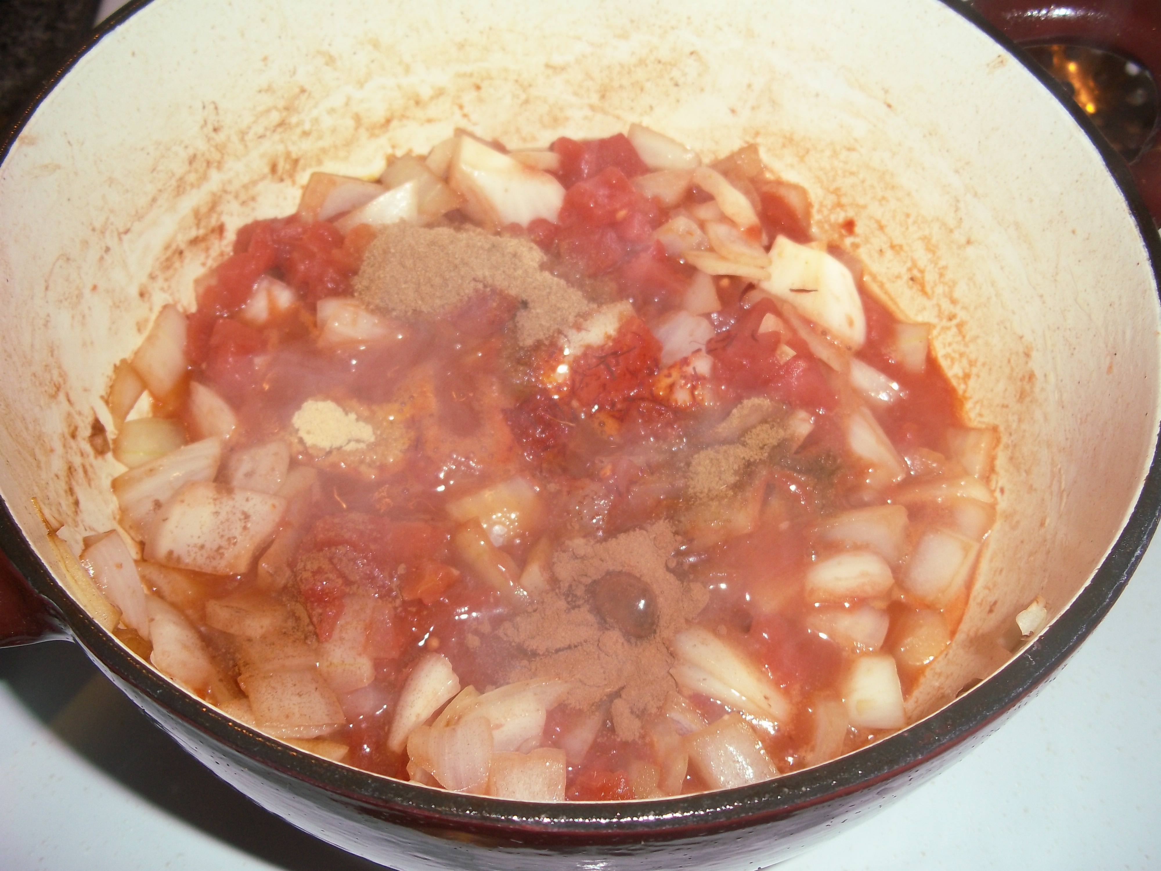 Next, the tomatoes get added along with some broth, and that gets to simmer for a bit along with the spices.