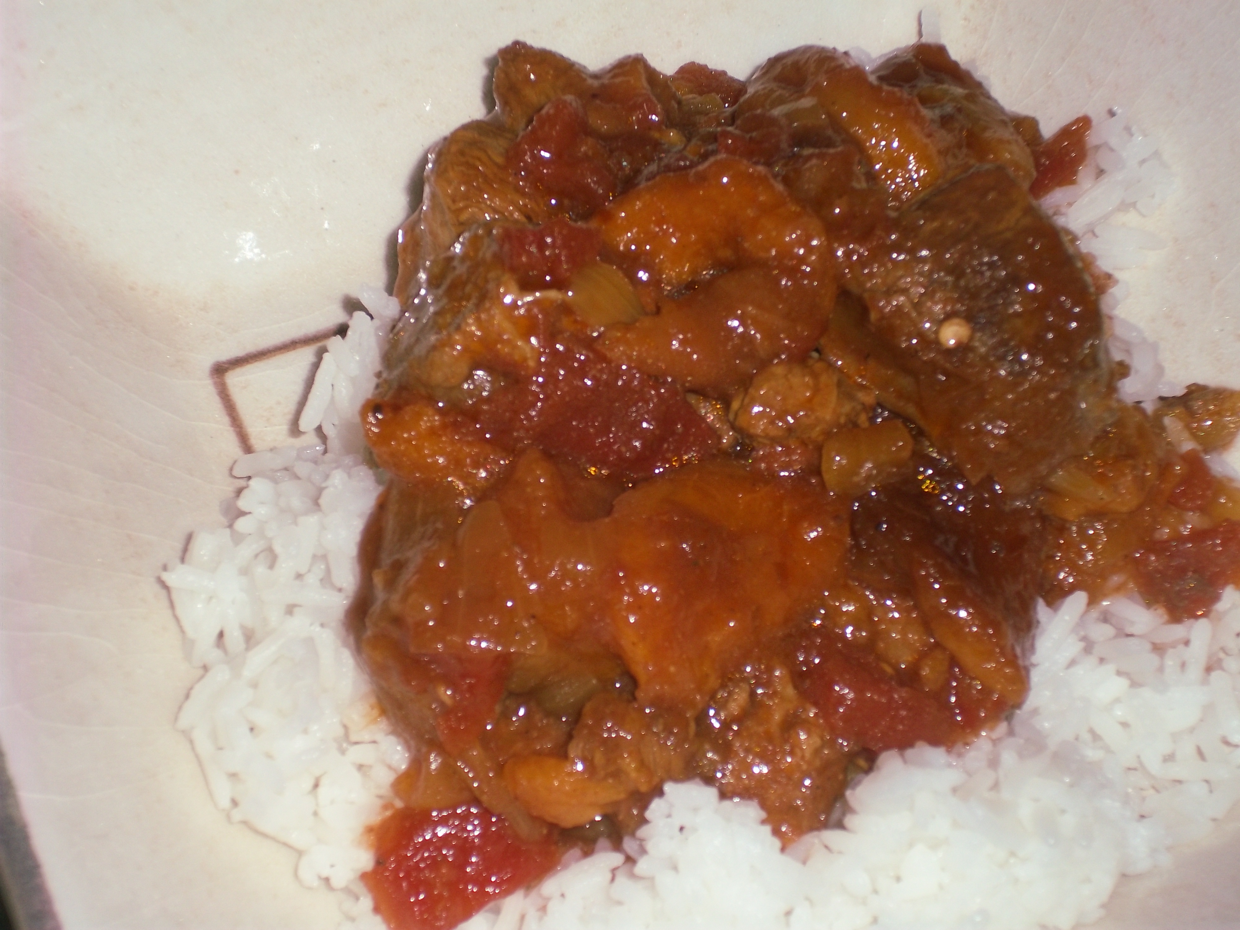 After about an hour or so (mine was longer – I was working and got sidetracked!), the dish comes out, gets a good stir and is ready to serve with your choice of something to take advantage of the lovely sauce. I chose rice. Toppings are toasted almonds and a bit of cilantro (no, I didn’t get that far, but there’s another meal where I can try that out).