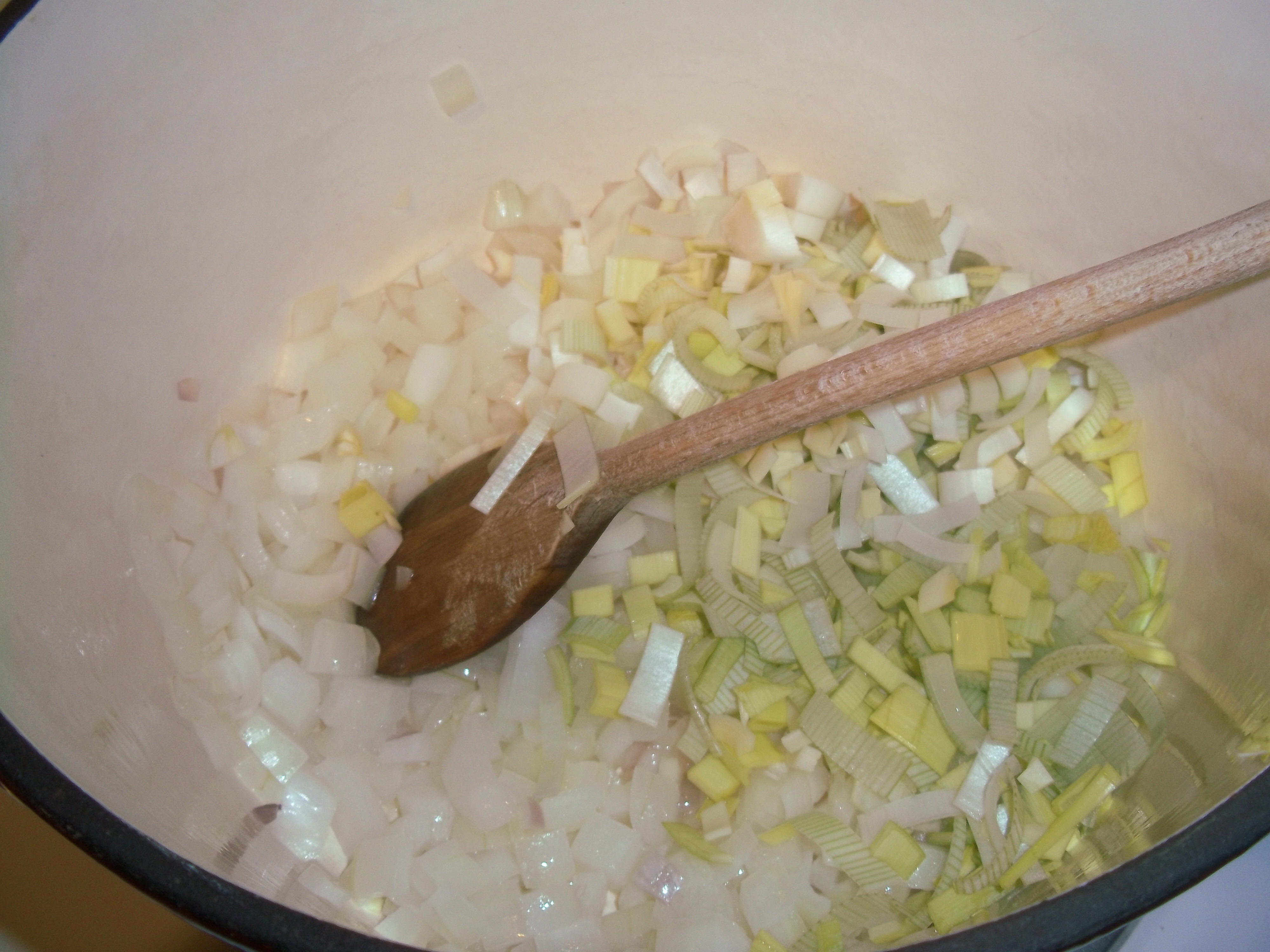 This is a simple layering of things – the onion, leek, garlic, (celery), shallot all getting a nice slow cooking in some butter. (note: I did make a half a recipe). The seasonings are salt and white pepper.
