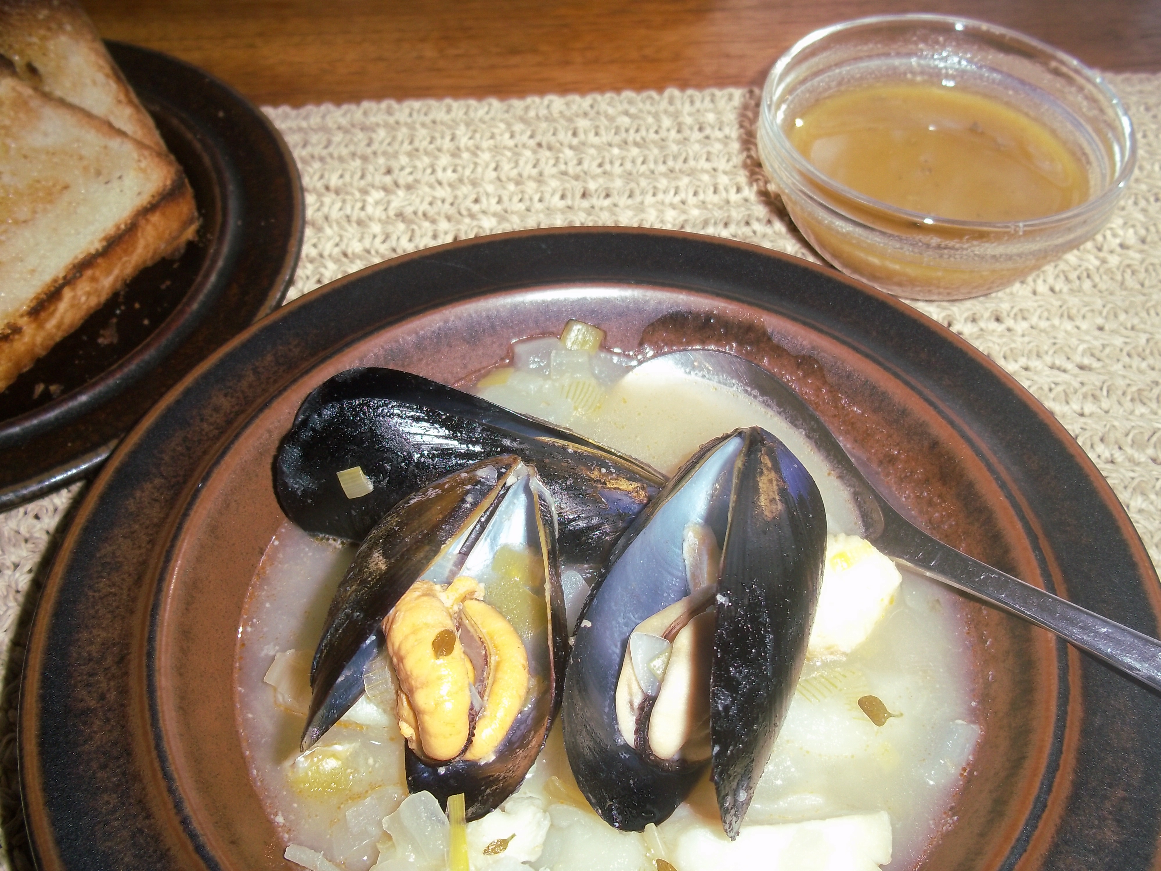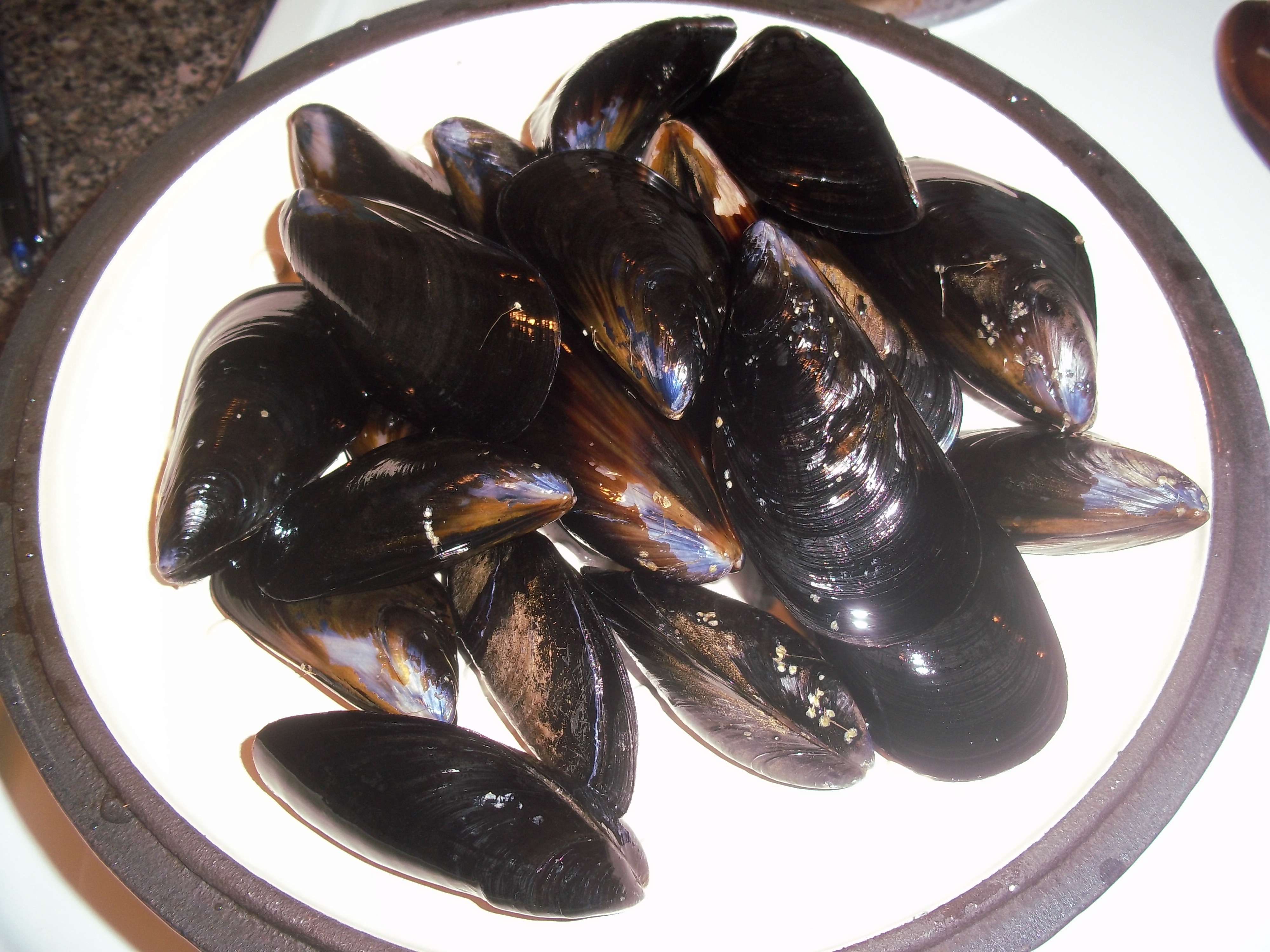 I was planning to have some for lunch, but really to save this for dinner. One of my mom’s very favorite things: mussels! So I only cooked a few for my lunch. But again, they are simply added to the top, and allowed to steam for a couple of minutes until they open. When I was cleaning them, I thought maybe there were a couple of varieties – I think I was right based on the cooked mussels.