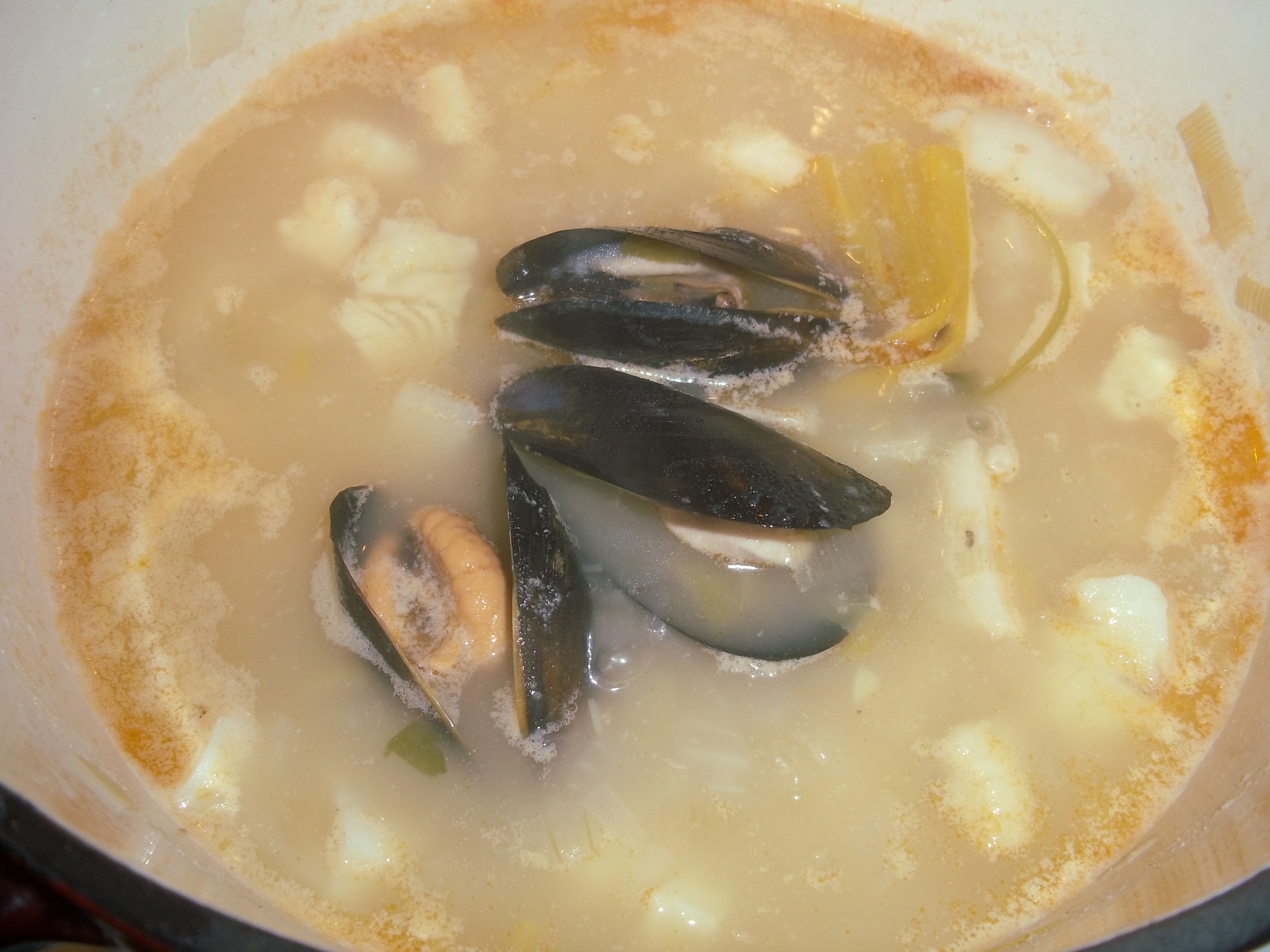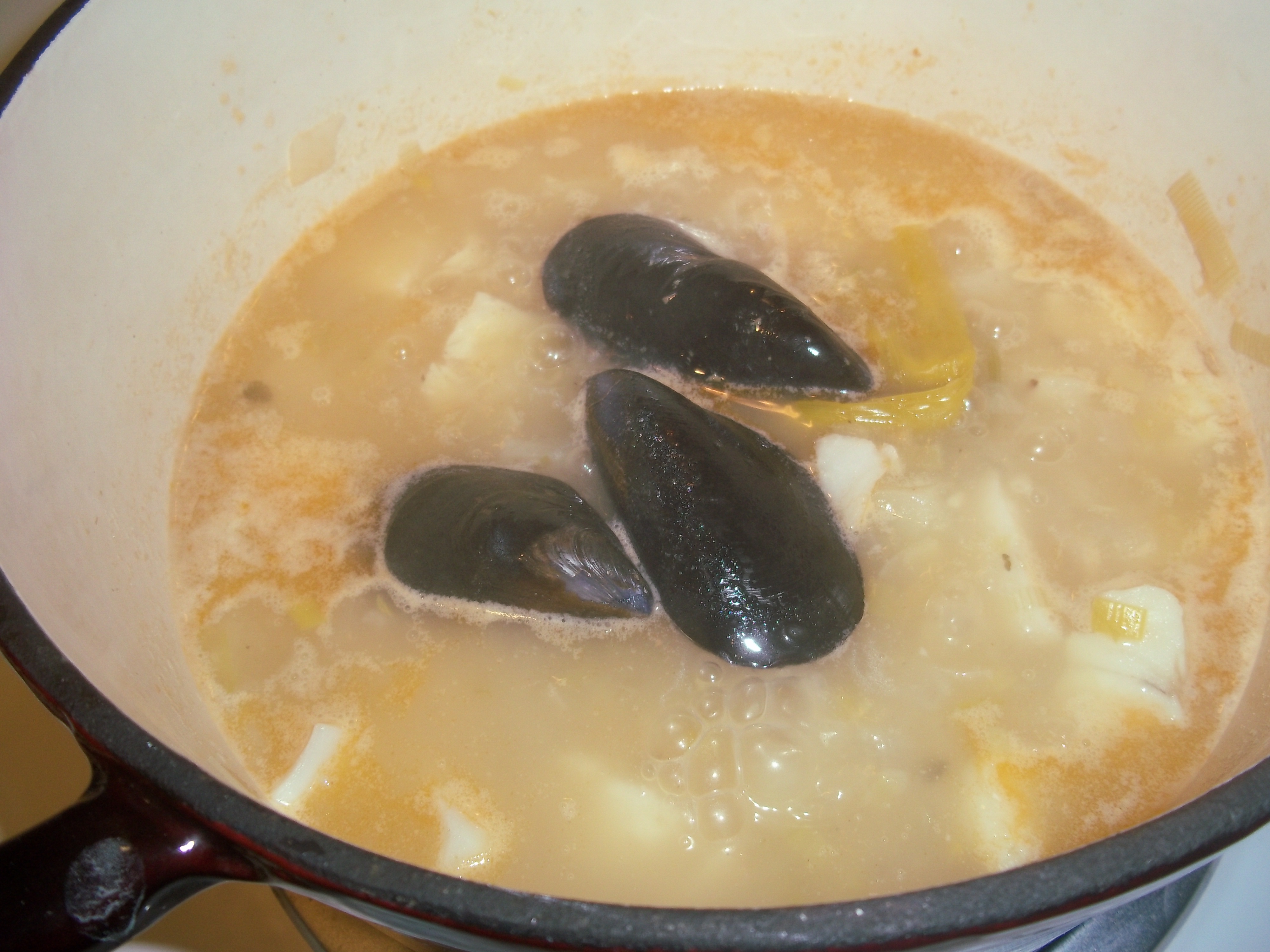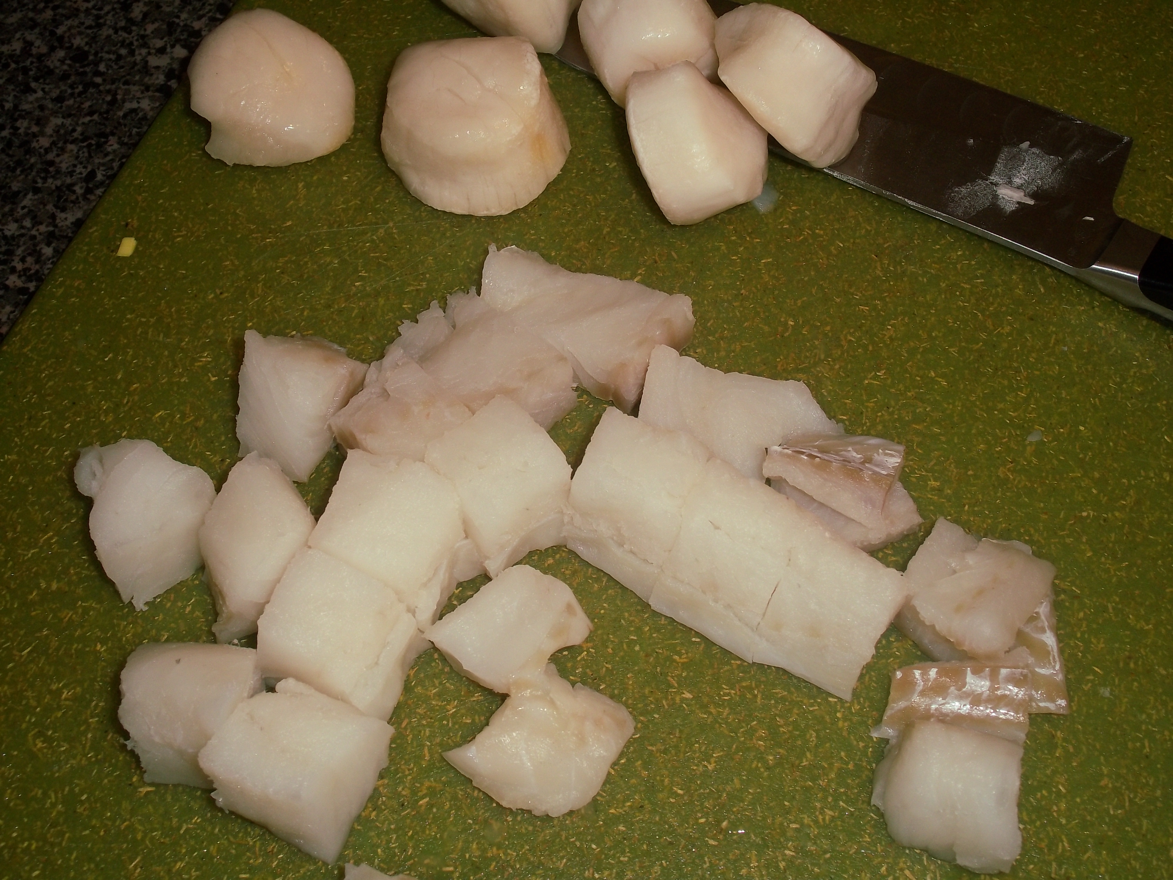 The mixture simmers for another 7-10 minutes, then the fish is added. It is supposed to be in about 1/2″ chunks, and can be a mixture of fish, which sounds great if you’re near the ocean! As it was, I picked up some true cod at WF and then, realizing that I didn’t actually buy enough, supplemented with some scallops I had in the freezer.