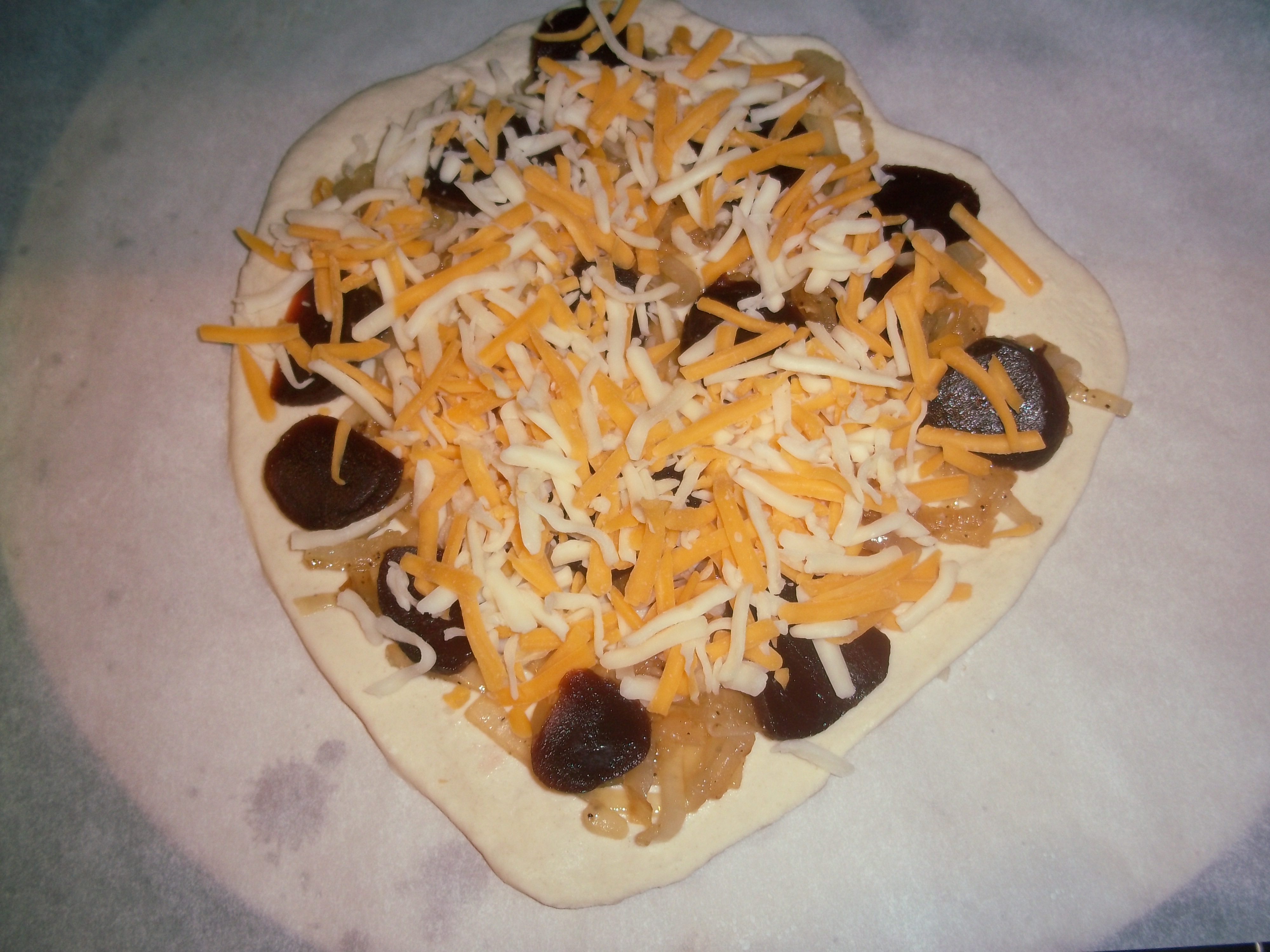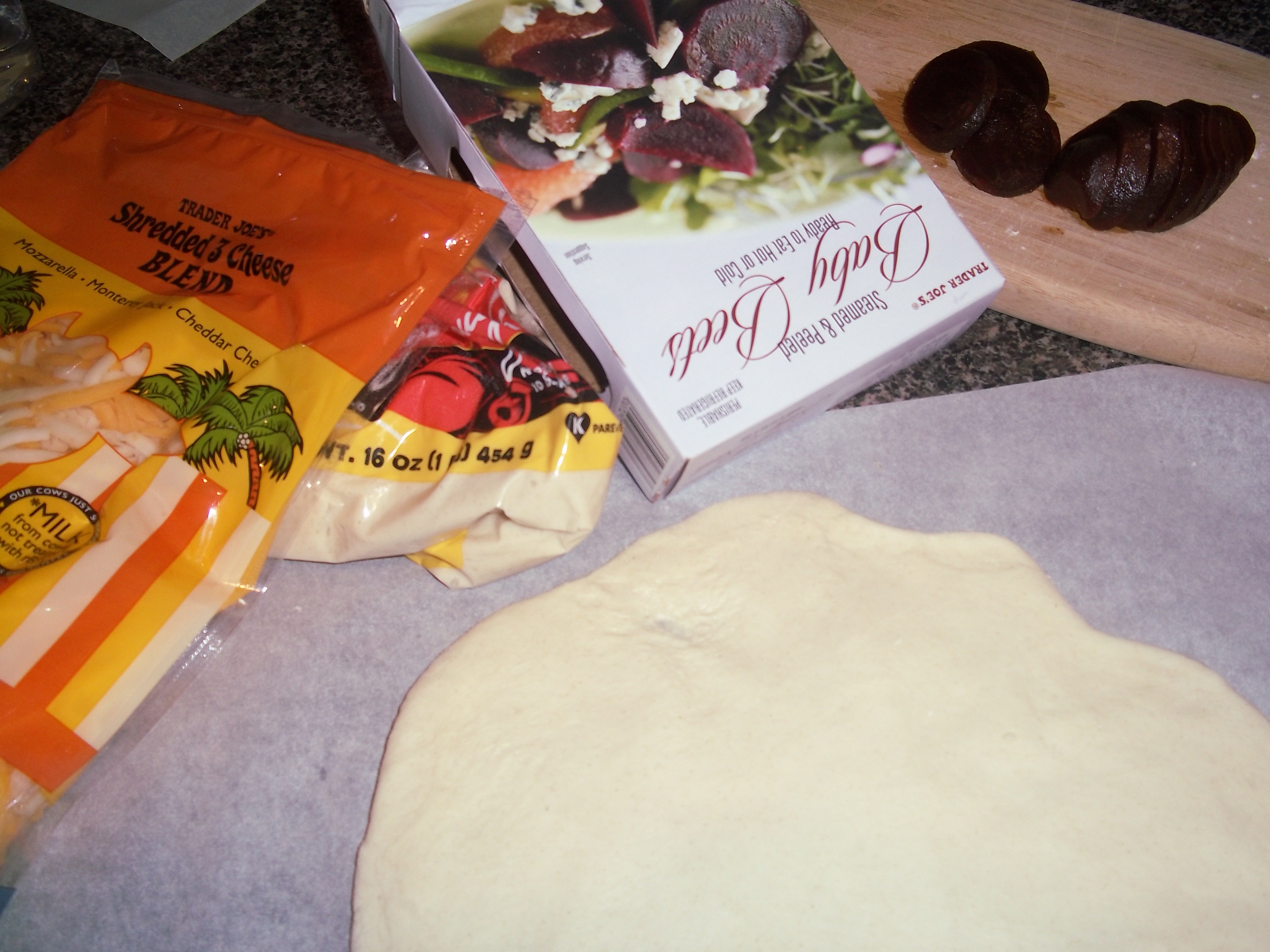 But I digress. Since I am not as much a fan of the dough from the book, I decided that I would try out (again) the prepared dough that I could get here locally. I hadn’t used it in a long time and thought it was worth a try. I also went with the prepared roasted beets I buy, and some shredded cheese I had on hand. Caramelized onions are the other main ingredient – tomato sauce is optional.