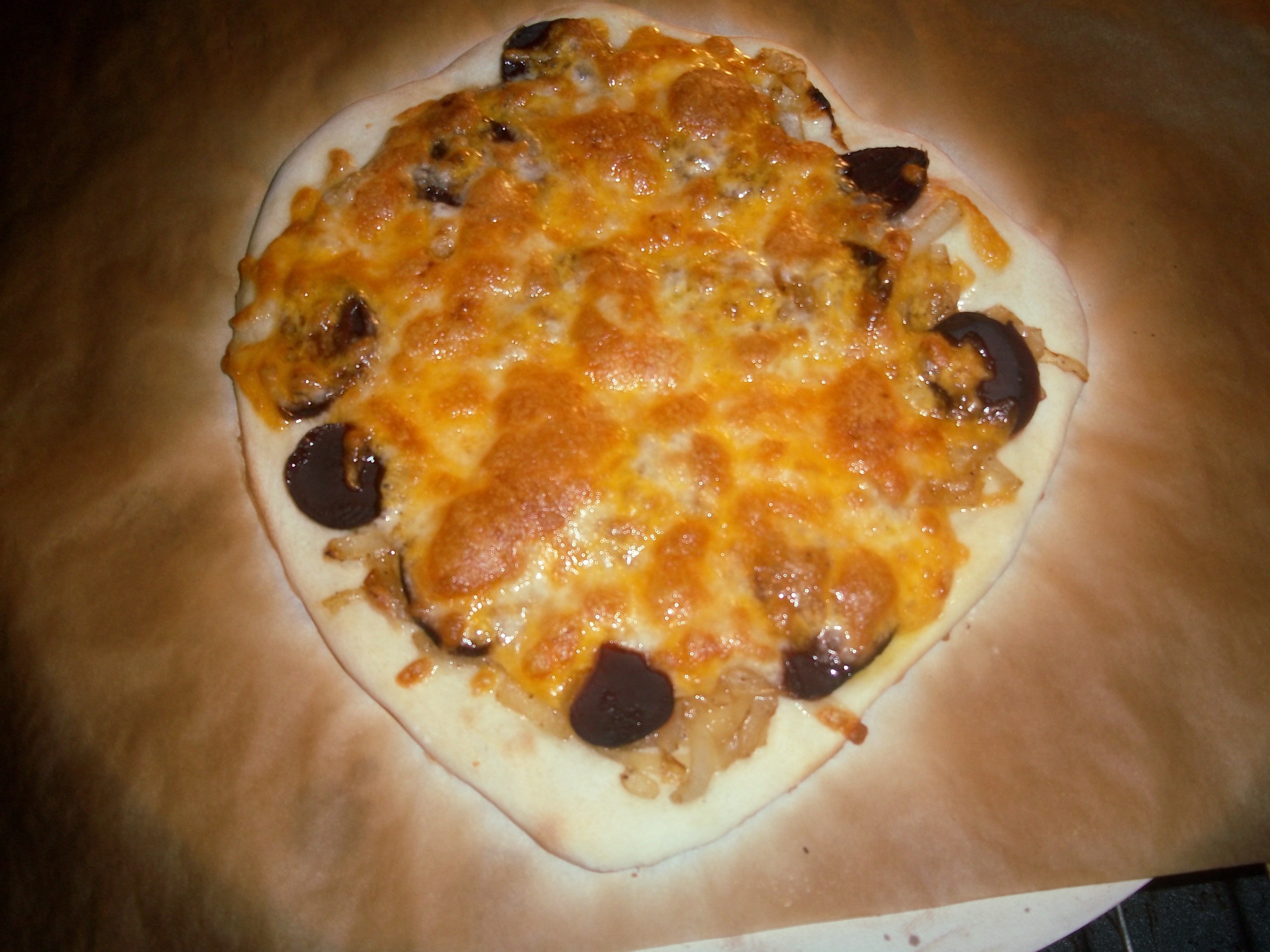 The pizza looked terrific from the oven. I wish I’d made the trip back to the store to get a different cheese (and I also think that just a bit of goat cheese would have been great here in addition to the required cheddar). Mine was a blend of good cheeses, but just not the depth of flavor that would have been good.