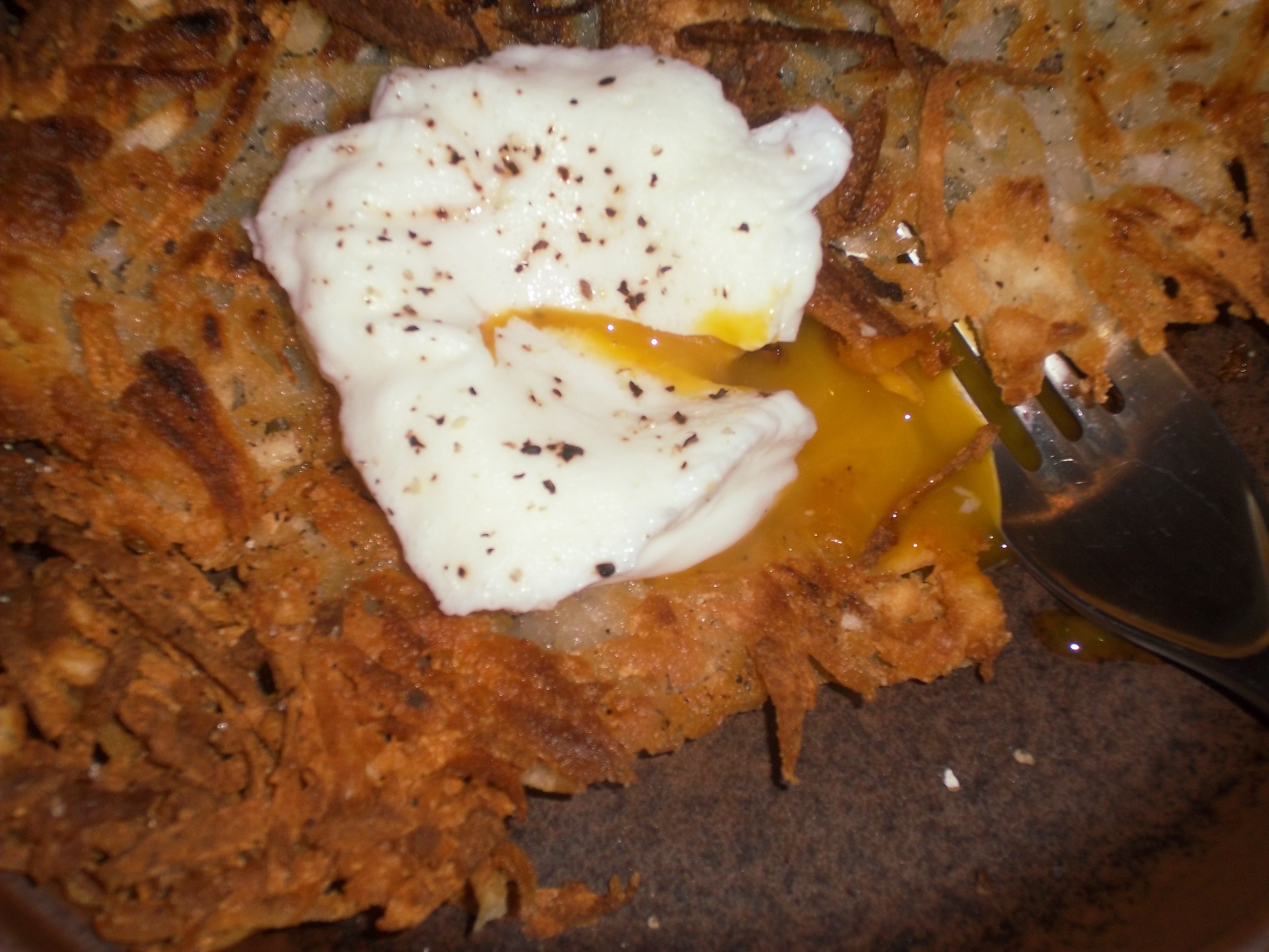 I’m afraid I should have stuck with the smaller ones – I think that as a beginner, I would have had more luck. Tricky to turn over, tricky to get brown all over without the outside too brown… I served mine with the poached egg – it was quite delicious!! Well worth the effort, and it didn’t matter at all that it wasn’t perfectly shaped!