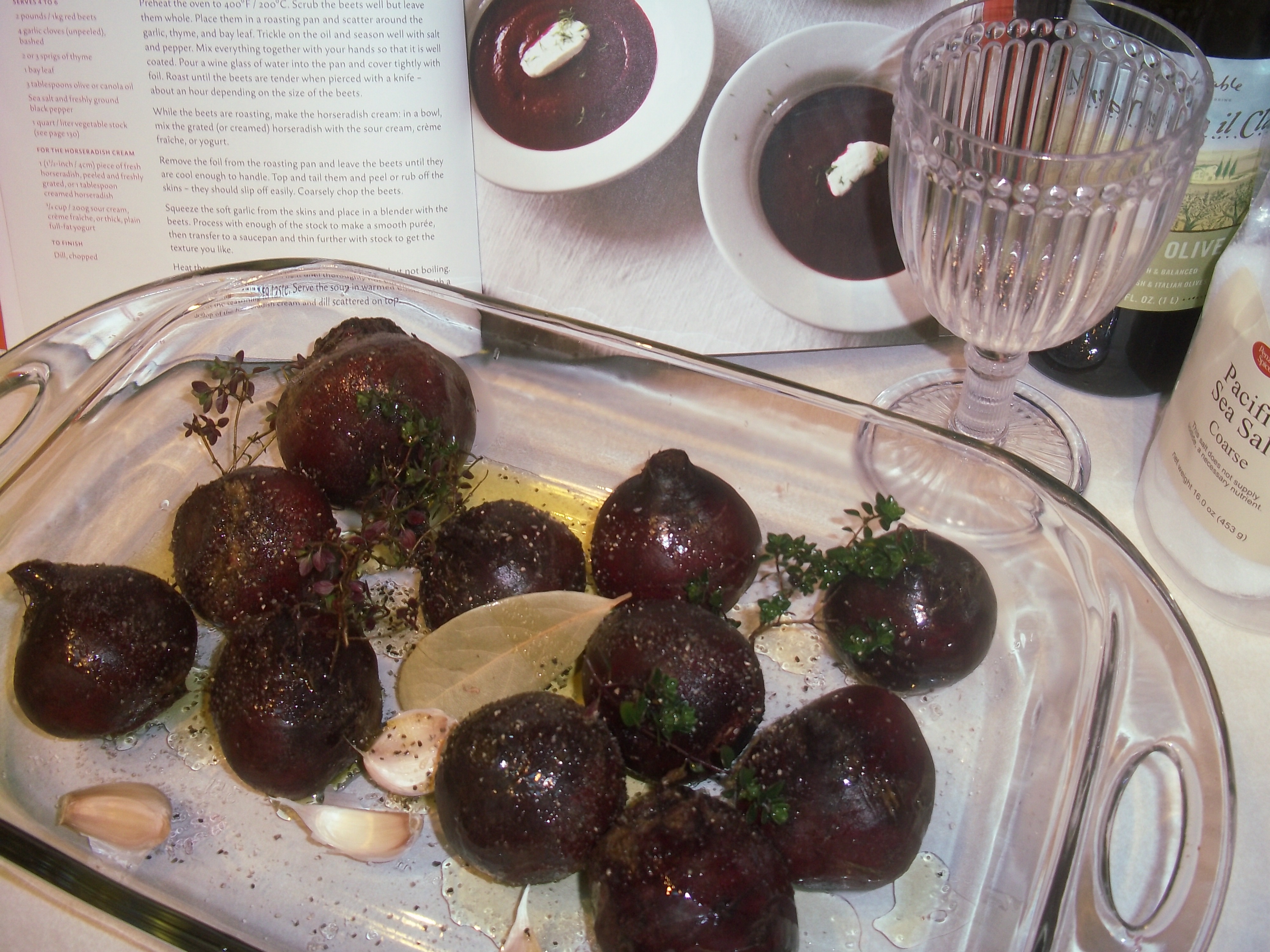 The beet soup is simplicity itself. I decided that this time I would actually roast the beets per the recipe, though I often pick them up pre-roasted and peeled. These were to roast with some fresh herbs, and whole garlic cloves that would then flavor the soup – so I thought I’d stick with the original, particularly as I was making this on a weekend.