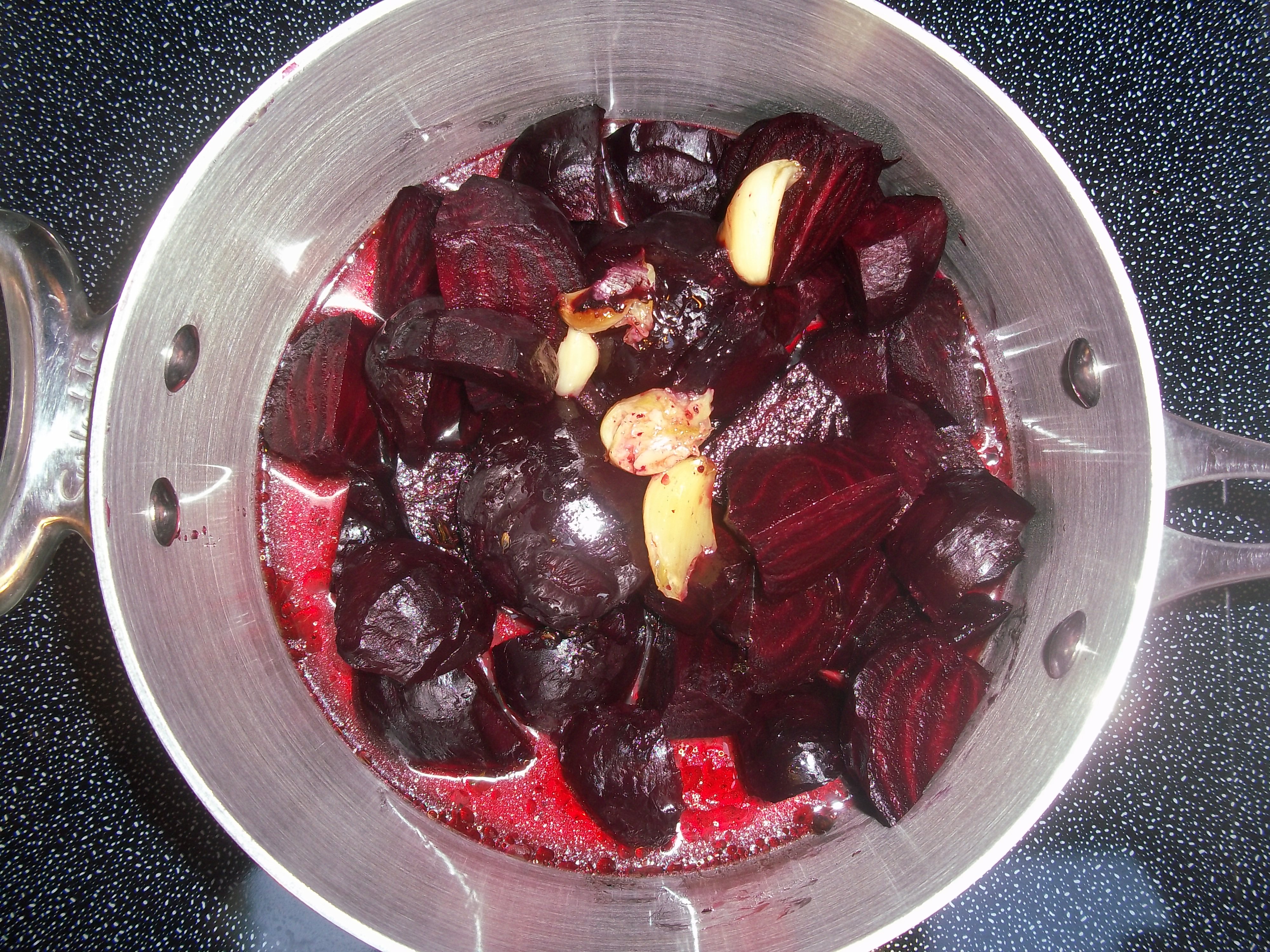 Once roasted, cooled a bit, and peeled, the beets, and soft roasted garlic are simmered with some stock, until the flavors are allowed to blend, and everything is soft. Then it gets blended to a lovely, smooth puree. It’s checked for thickness, adding more stock as necessary, as well as seasoning with salt and pepper as required.