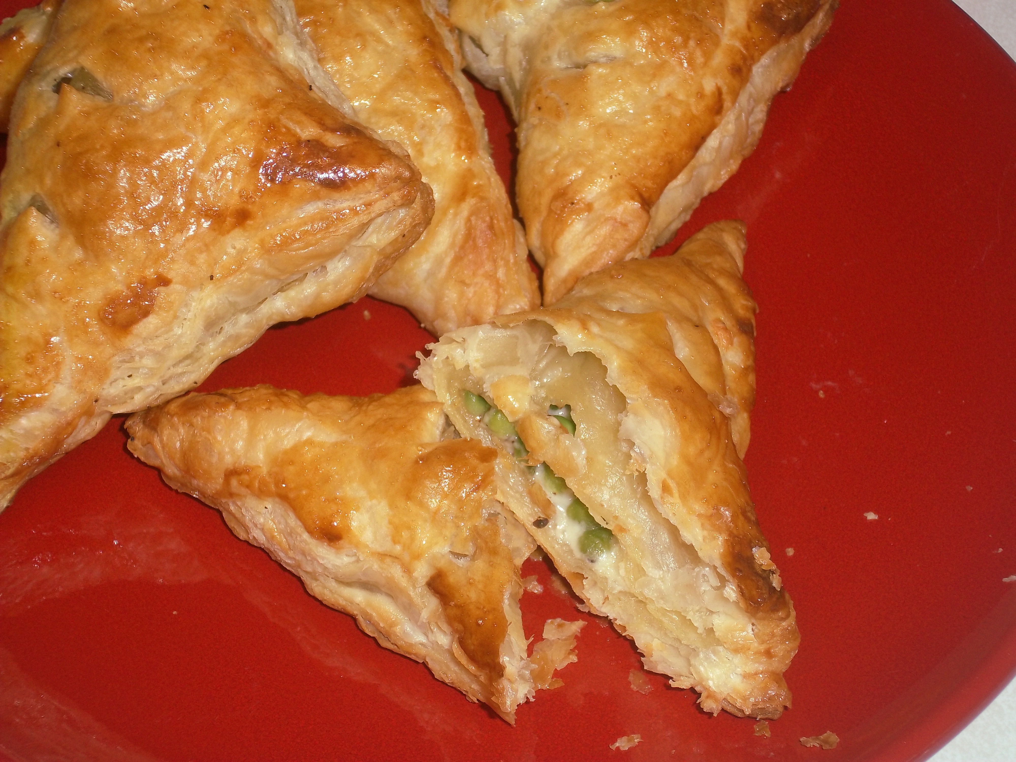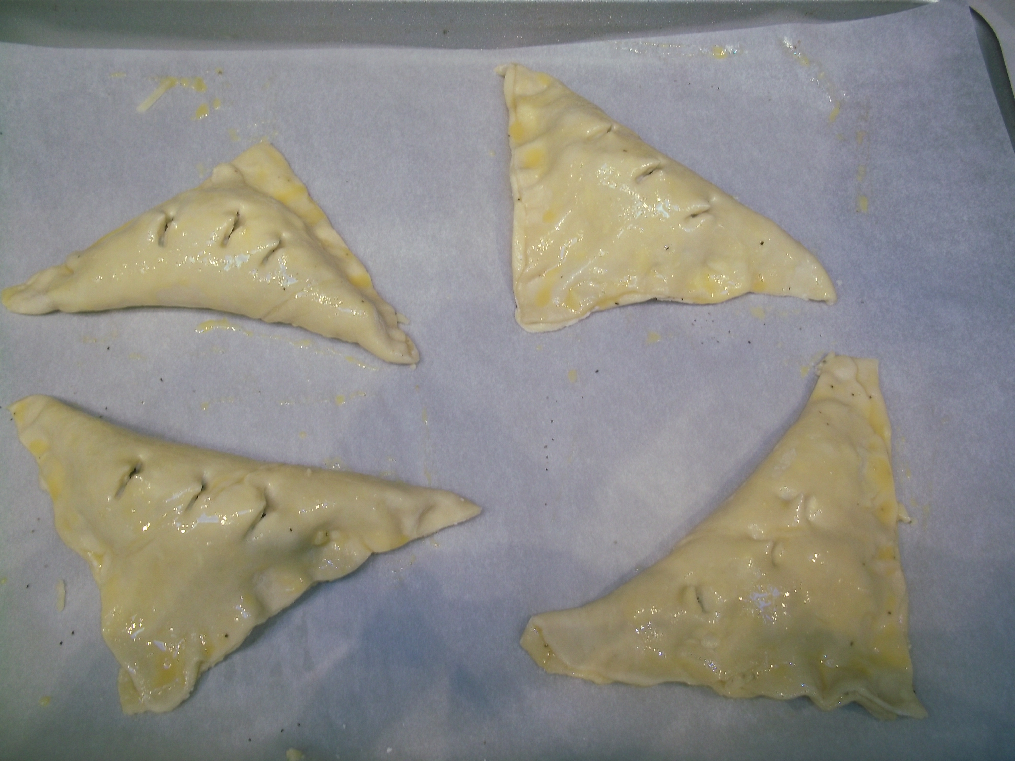 The Cheesy Peasy Puff Turnovers were a bit of fun (and deliciousness). They really are made from pantry staples – frozen puff pastry, some frozen peas, and then whatever cheese you might have on hand, though the suggestion is for aged cheddar. The original recipe calls to make one large turnover, but of course, individual pastry servings are always fun, so I decided to make 4 pastries. Simply – you cut the squares of pastry, top with peas and cheese. Brush the edges with egg, seal them, and then use the egg wash over the top. The puffs get baked in a 400 degree oven for about 20 minutes.