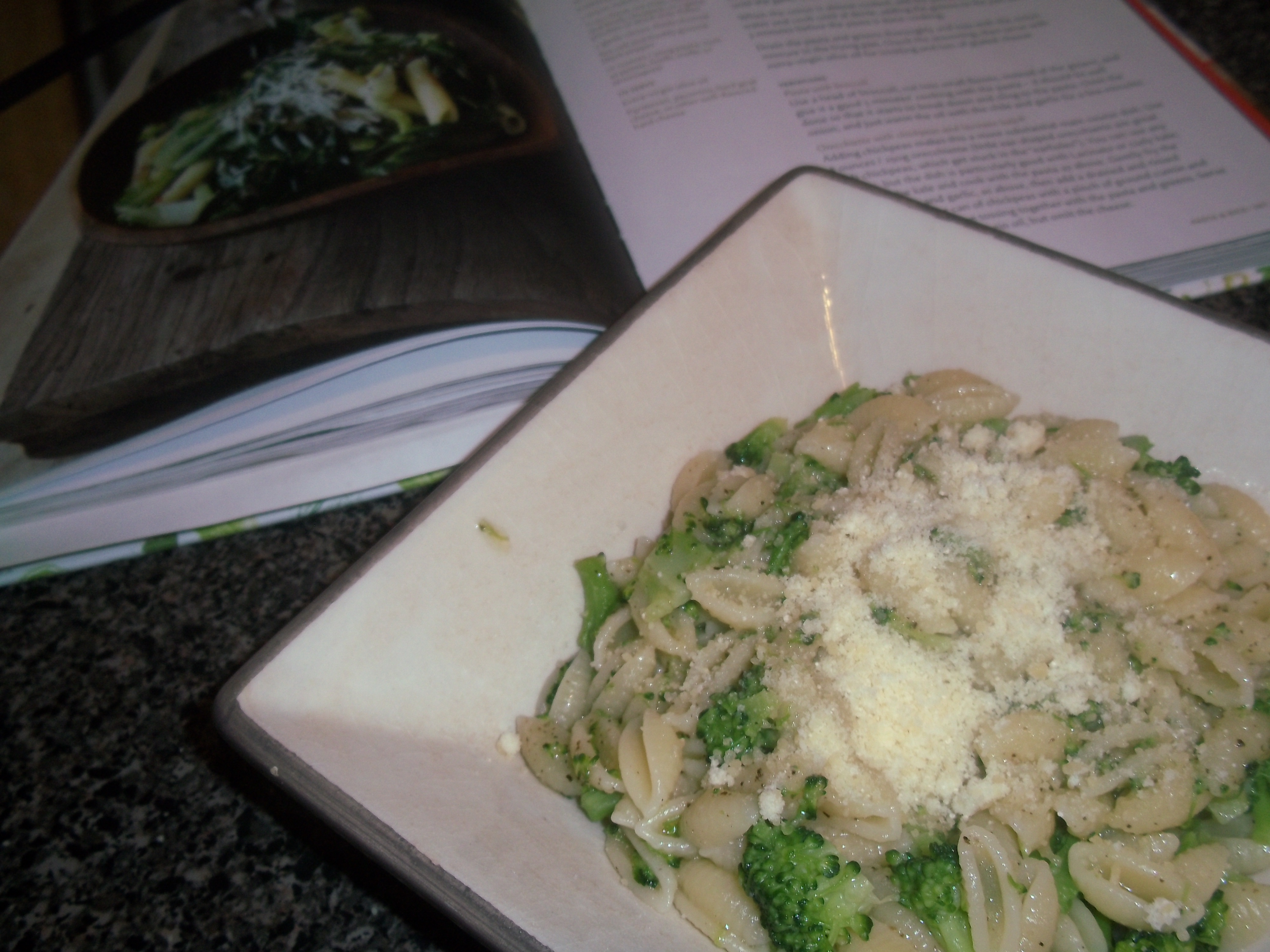 My final make-up dish was pasta with greens garlic and chile – the broccoli version. This is an easy, comforting dish – pasta and broccoli get cooked (together at the end of the pasta-cooking), drained and tossed with a bit of garlic-infused oil and Parmesan. What a quick and tasty dish for a quick dinner.