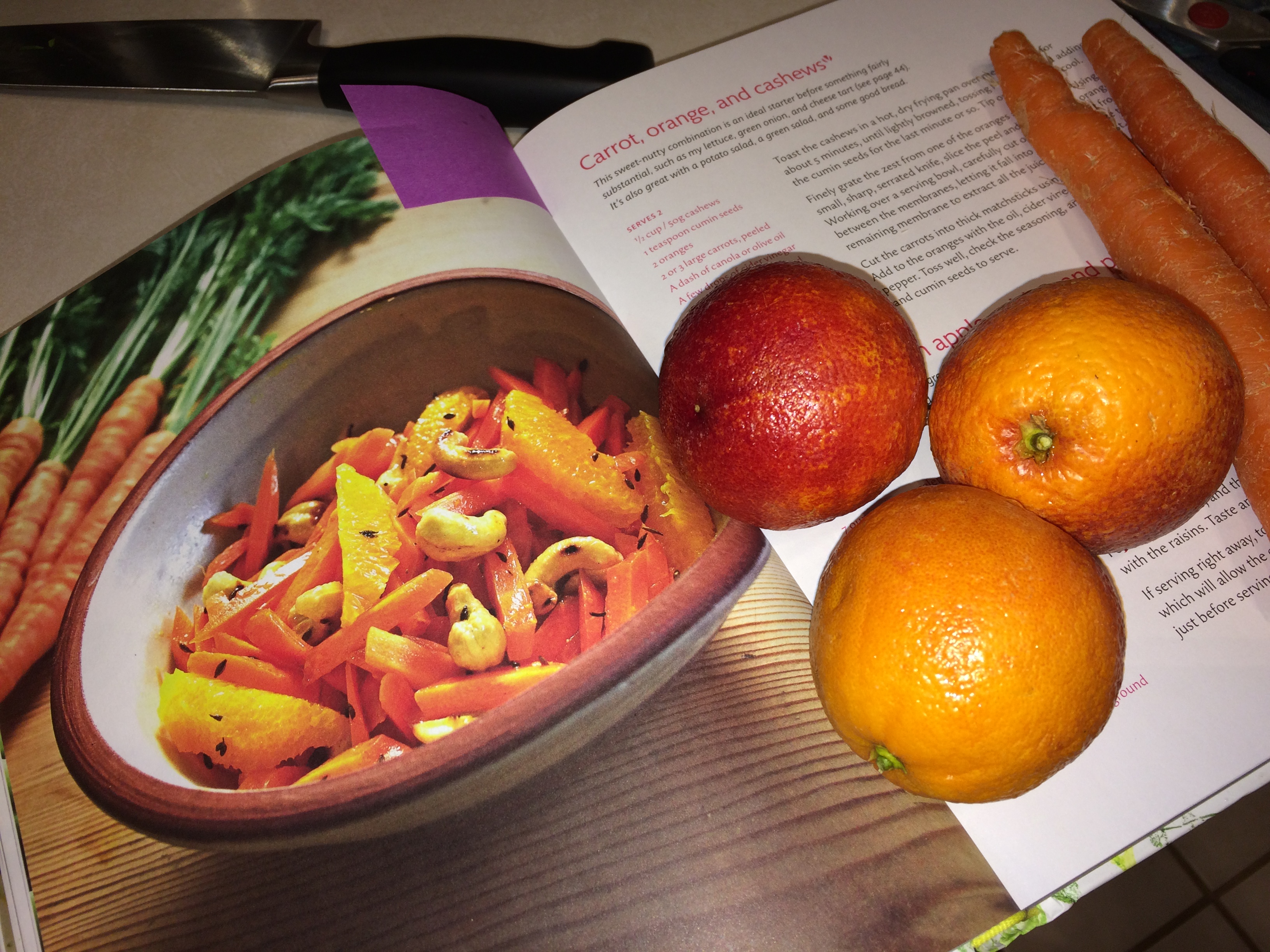 The cashews get toasted, the oranges sectioned, carrots turned into matchsticks. There’s really no dressing, just the grated zest, a drizzle of oil and a dash of vinegar- and a bt of cumin, salt and pepper.