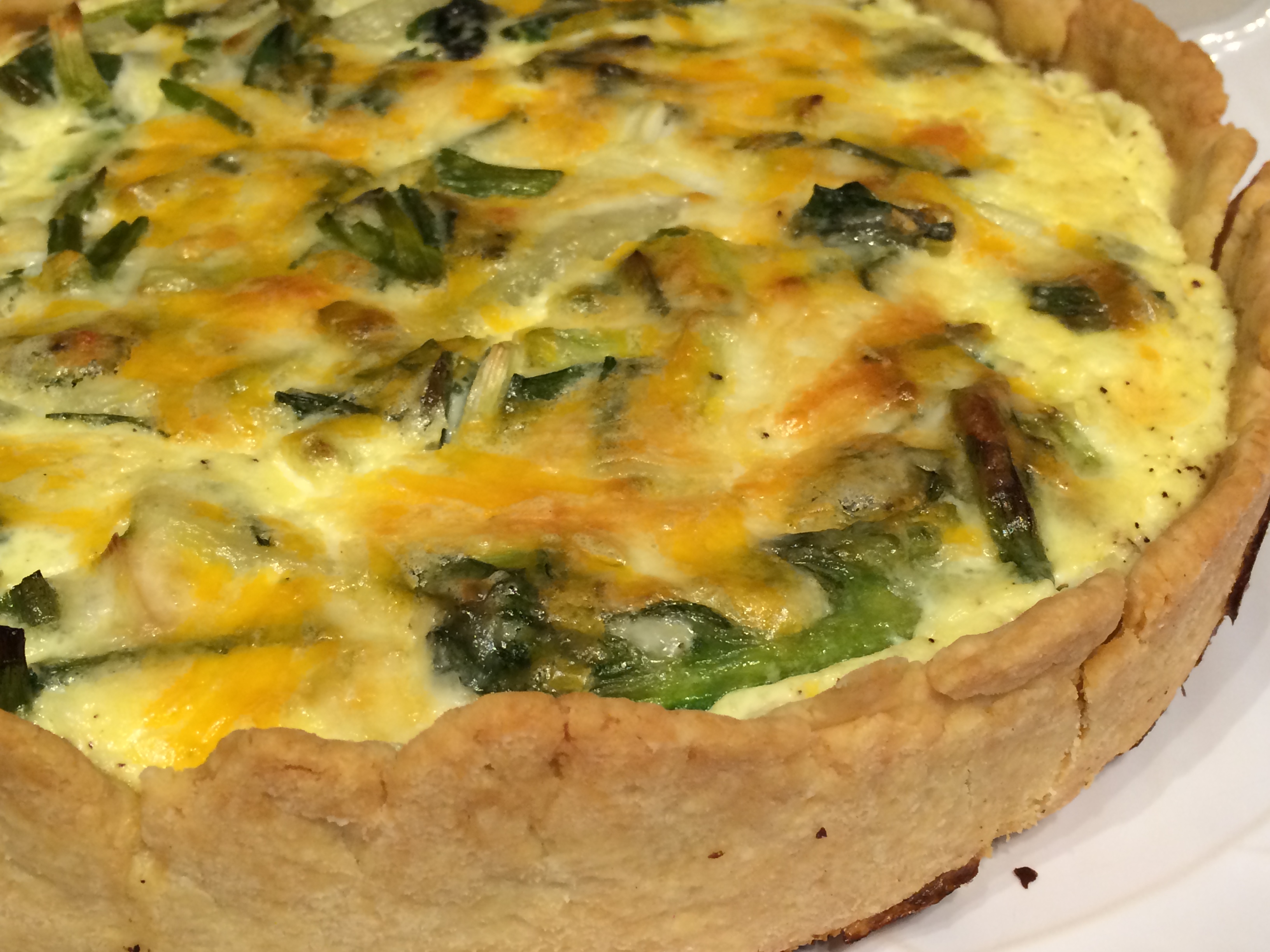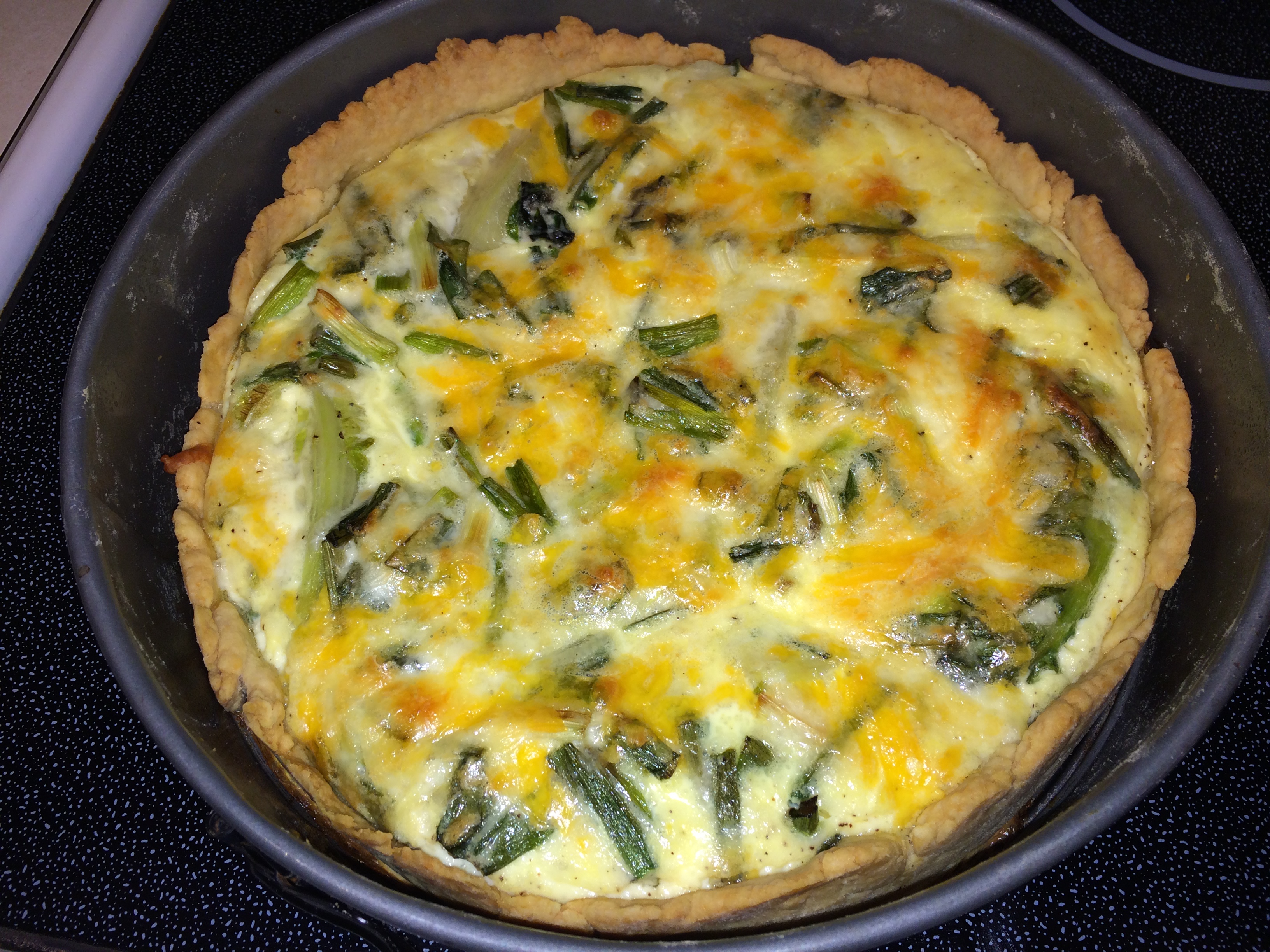 The shell gets par-baked. At first with foil (and beans or pie weights if I’d had them handy), and then alone. Overall, it was about 30 minutes, which seemed quite a long time, but never fear. Then the vegetables were added, and topped with cheese. A custard of eggs, yolks and milk are added. Sadly, my rough edges had one little spot that was too low – and some filling seeped over the side as it baked.