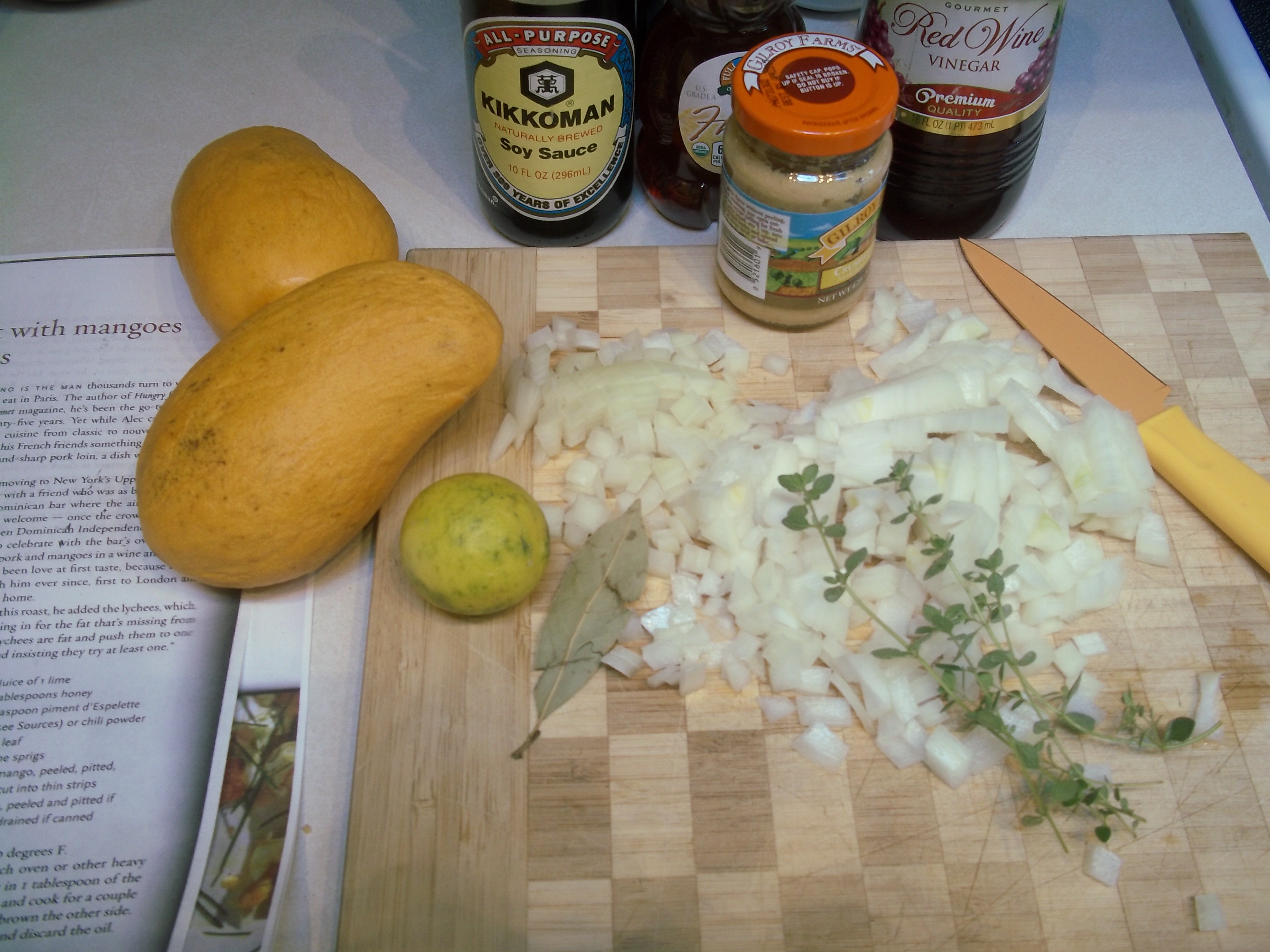 This week’s French Fridays recipe is one for a pork roast, flavored with some Pan-Asian inspired ingredients. I associate mangoes with Australia where I first tasted truly wonderfully perfumed mangoes fresh from the tree. The sauce also includes soy, honey and garlic. The original recipe also included lychees, but I wasn’t at the right market for those, so I doubled up on the mangoes.