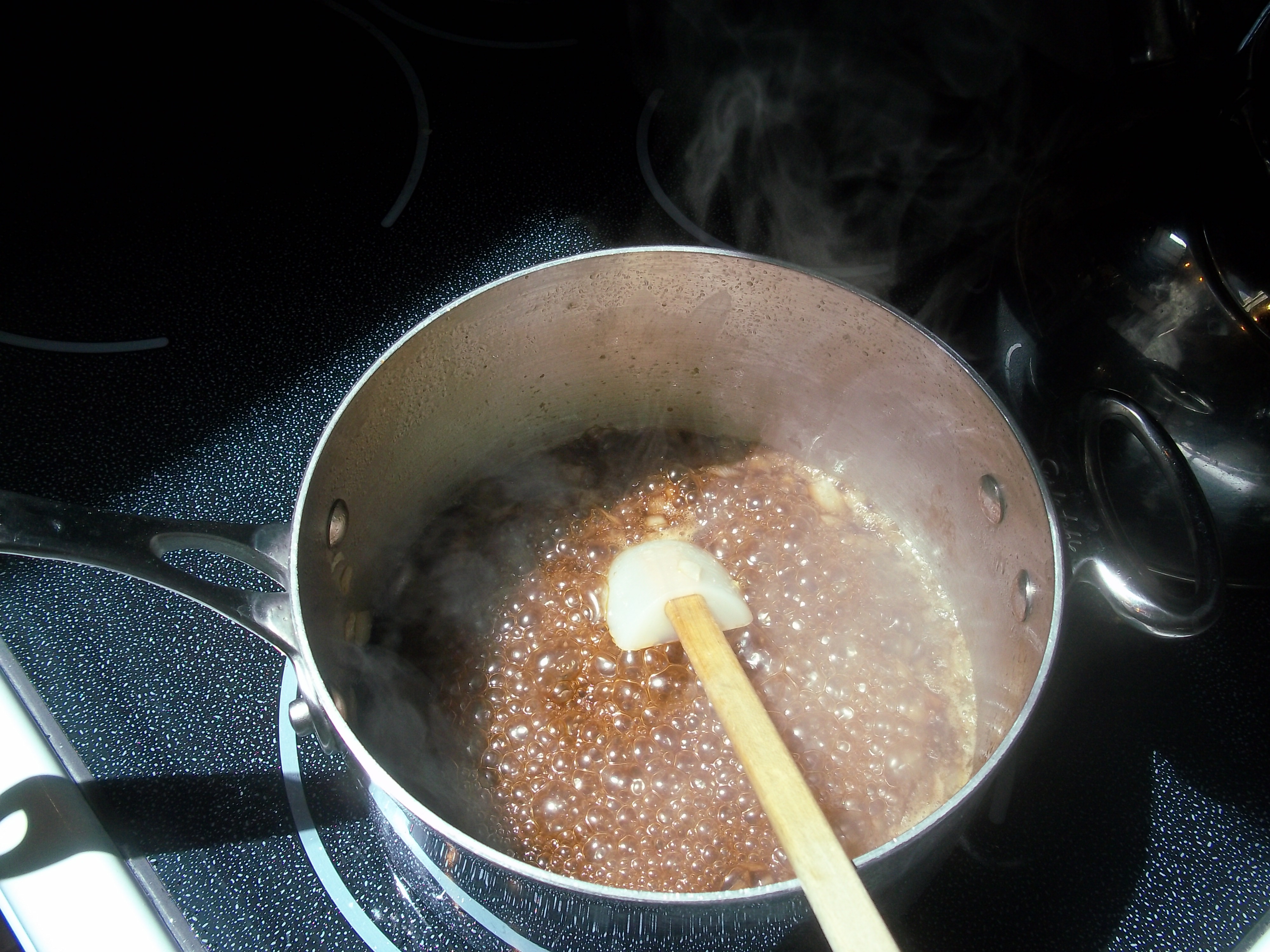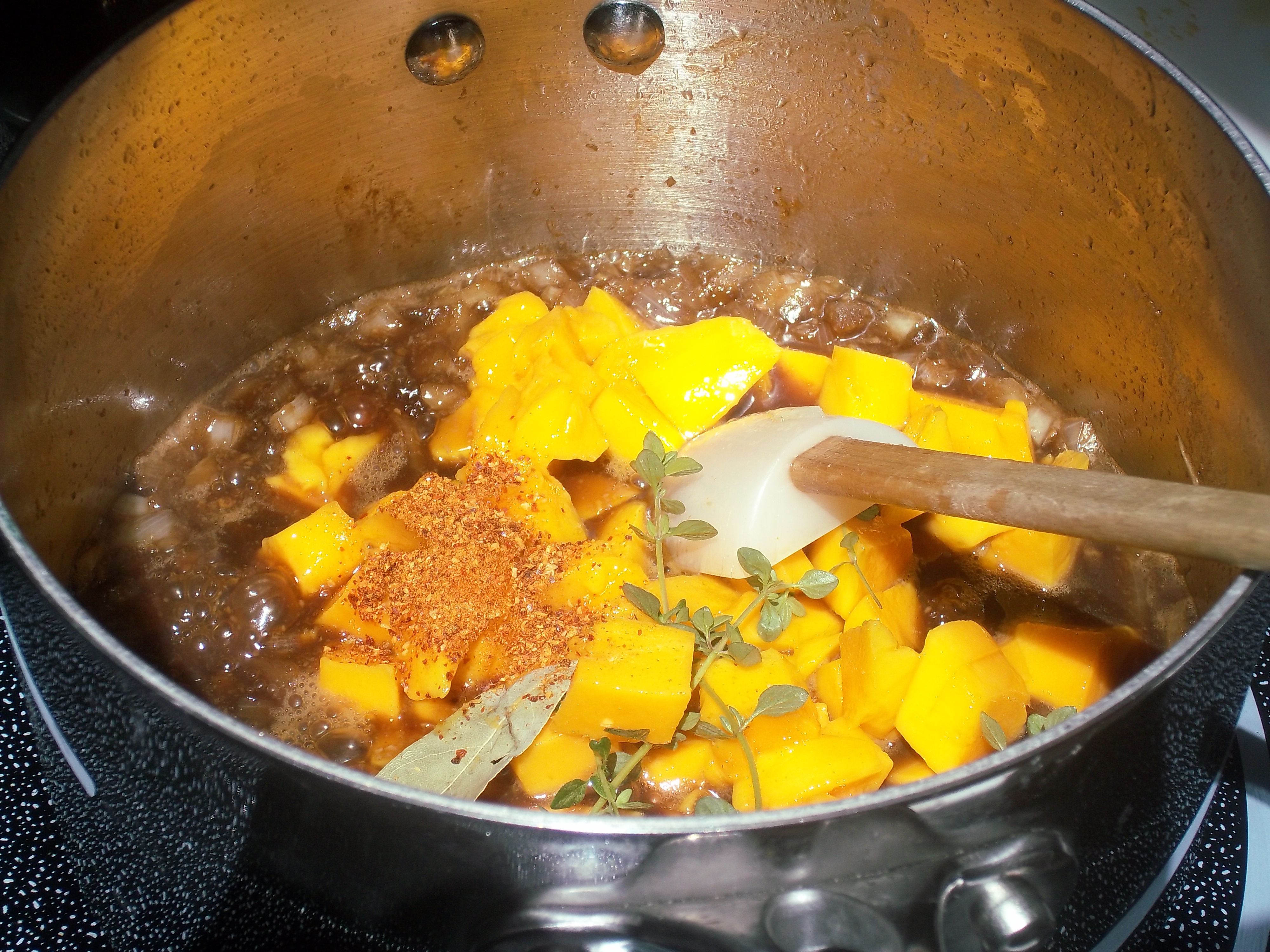 The sauce gets created by layering the different ingredients, Sauteing, reducing, etc., finally ending with the mangoes being added. (my kitchen in Sedona is apparently really bright sometimes – skylights!)