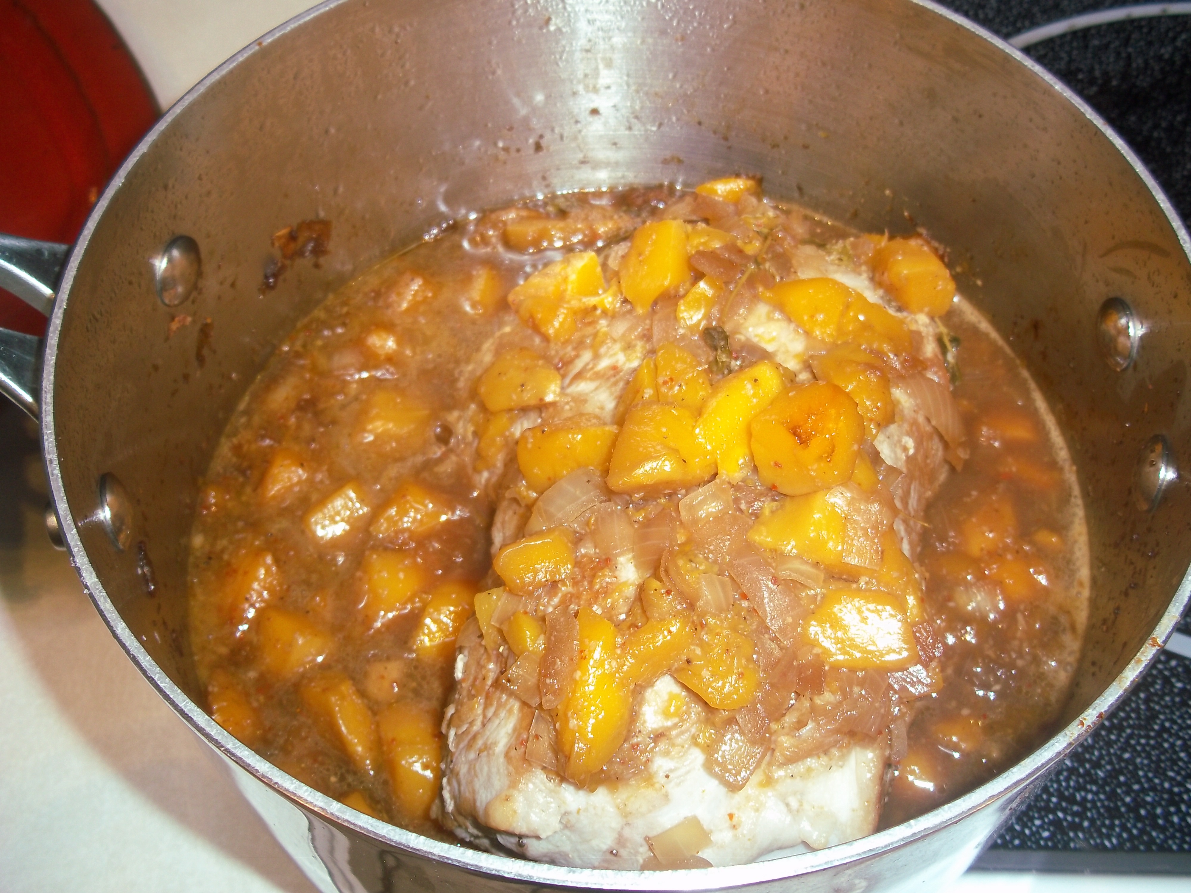 The sauce gets pored over the browned pork roast, sealed tightly and popped into the oven for about 30-40 minutes.