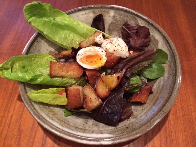 I was able to use some home-made bread for the “fried bread” part – really, just freshly made large croutons. I love any salad with a softly boiled/poached egg. And the dressing was another of the simple ones that come together so quickly with just a bit of Dijon, garlic olive oil and vinegar. Hugh typically calls for cider vinegar, but I usually just use red wine vinegar – but either will do. You just need to ensure you season it with salt and pepper before using, since it needs to be pretty flavorful before it gets to the salad.