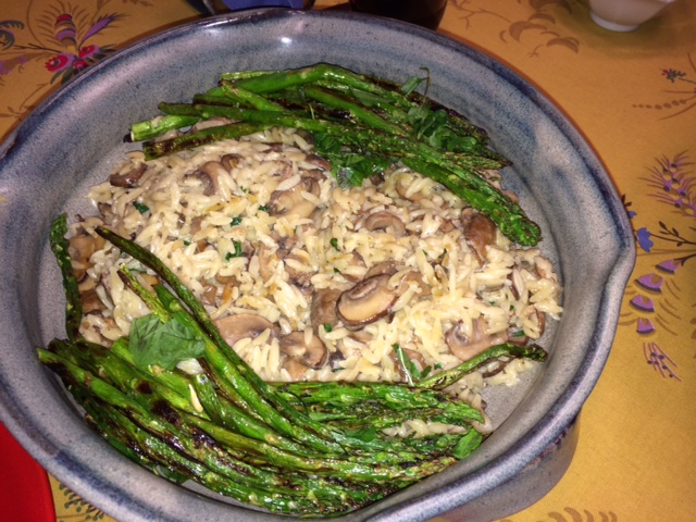 Finally, I had a small dinner party. The goal was to serve vegan. As it turned out, the friend that practices a vegan diet isn’t all that strict, but it’s always a fun challenge. While the Mushroom “risoniotto” isn’t strictly vegan, I just eliminated the butter, didn’t add any cheese (just at the table), and would have left out the cream – but was told I should just go ahead and add it. I’ve made this before and it’s delicious! To go with that, I made the Grilled asparagus spears with lemon dressing. To be honest, this is a pretty typical offering, so instead of the skewers, I just used my grill pan.