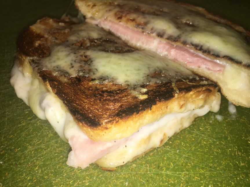 This sandwich is a kind of like a toasted ham and cheese – except that there’s Béchamel sauce on the inside, and more toasted cheese on the outside. You had me at Béchamel! That is actually the first thing I probably ever learned to make, even though we called it white sauce in Michigan. But it’s a wonderful addition to everything, particularly “stuff on toast” – so why not inside the toast?