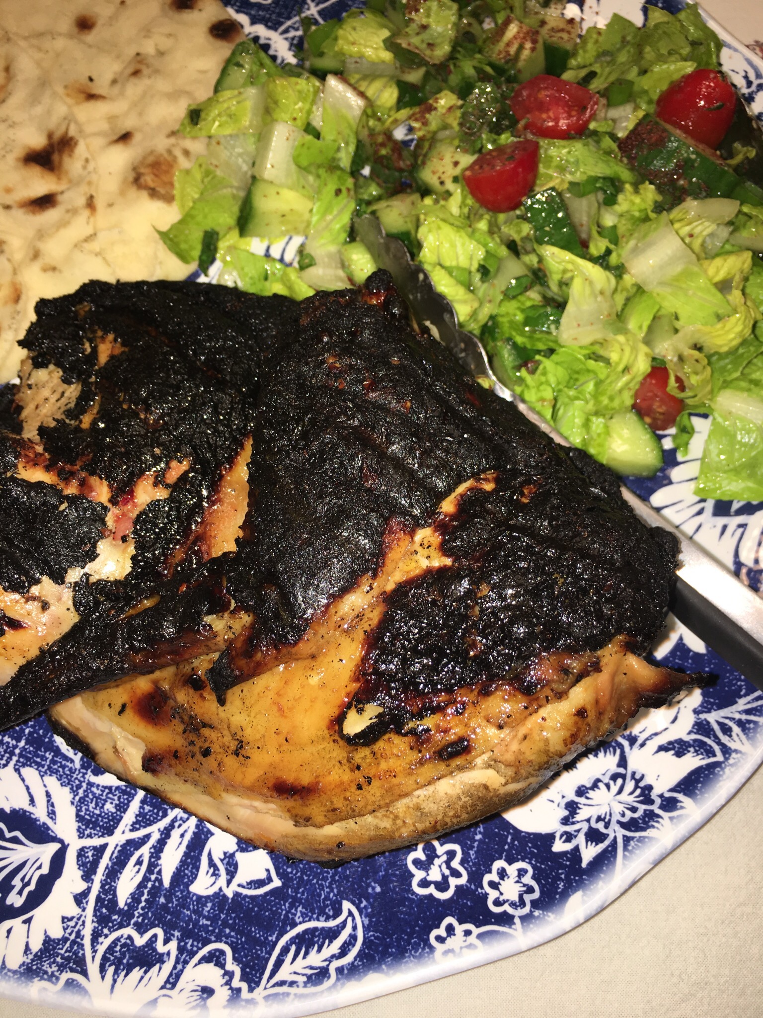 Anyway, I was intrigued by the recipe. David suggests that the chicken can be cooked on the grill. The first time I made it – I got a US sized half chicken, and did just that.