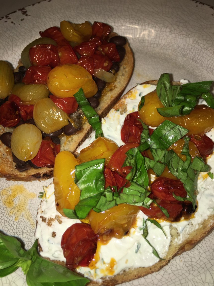 I love that you did a twofer – the crostini is brilliant and the Smitten Kitchen dish sounds just as good. Making the most of high season tomatoes is so gratifying. And I like that you were able to improvise for the cheese. It’s the fresh herbs that really take this over the top, whether or not you strain yogurt.