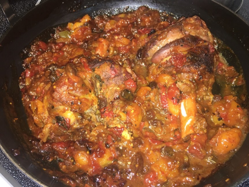 Over the course of several hours, shanks are turned, dried apricots and raisins are added.