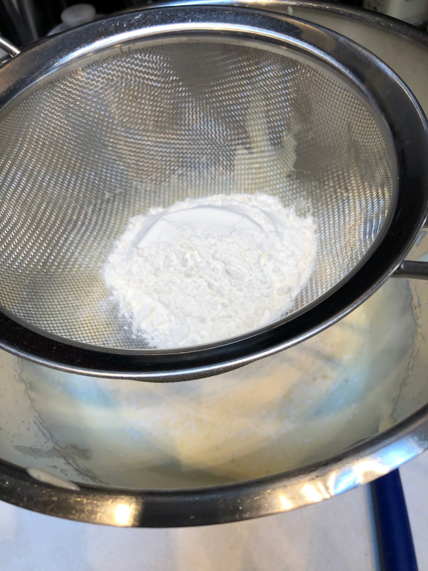 Flour gets gently folded in along with some butter, then into a prepared pan and baked for a few minutes. Once baked, the cake gets turned out onto a towel with a little powdered sugar, rolled up and left to cool for an hour.