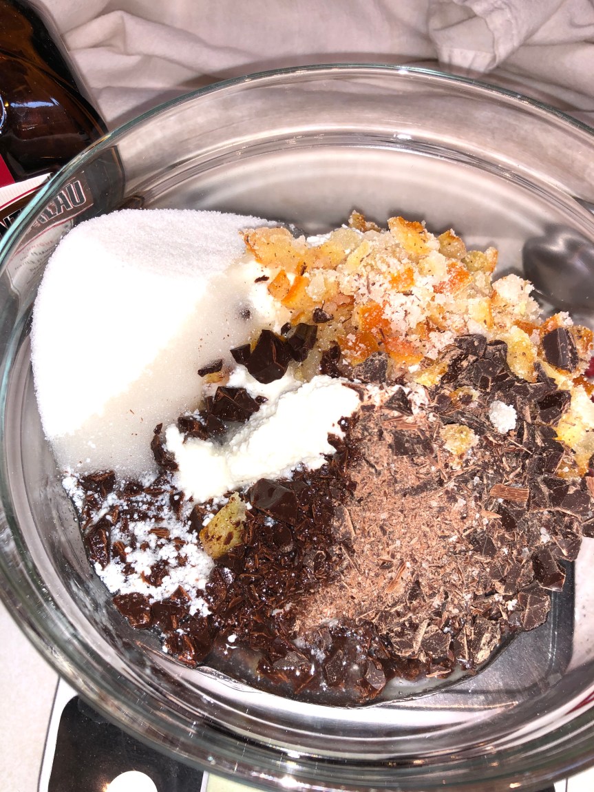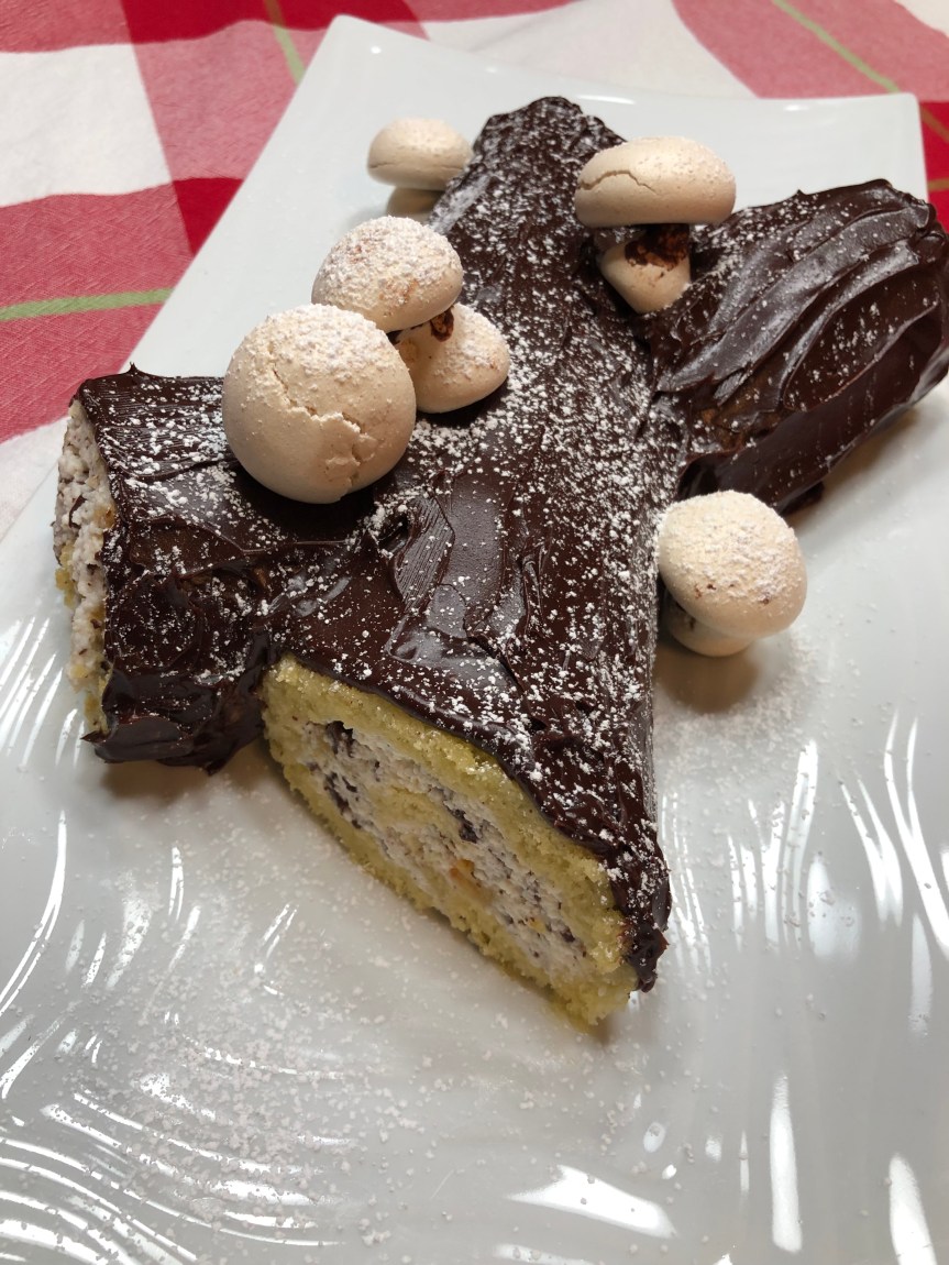 This version is almost like a soft cannoli! Dark chocolate, candied orange peel and ricotta as a filling for a classic genoise, all covered in dark chocolate “bark”.